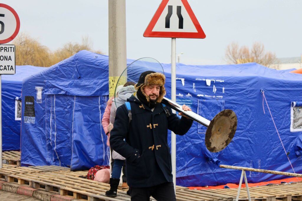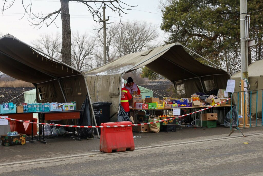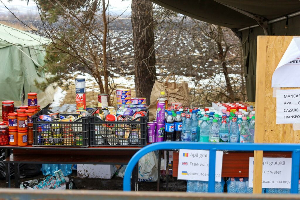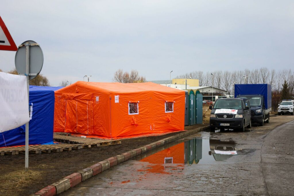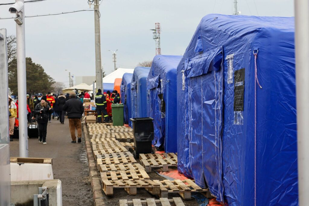 Tæt på den rumænske grænse står store blå telte på stribe, hvor ukrainerne midlertidigt kan opholde sig og stille sine ting, når de er kommet ind i landet.