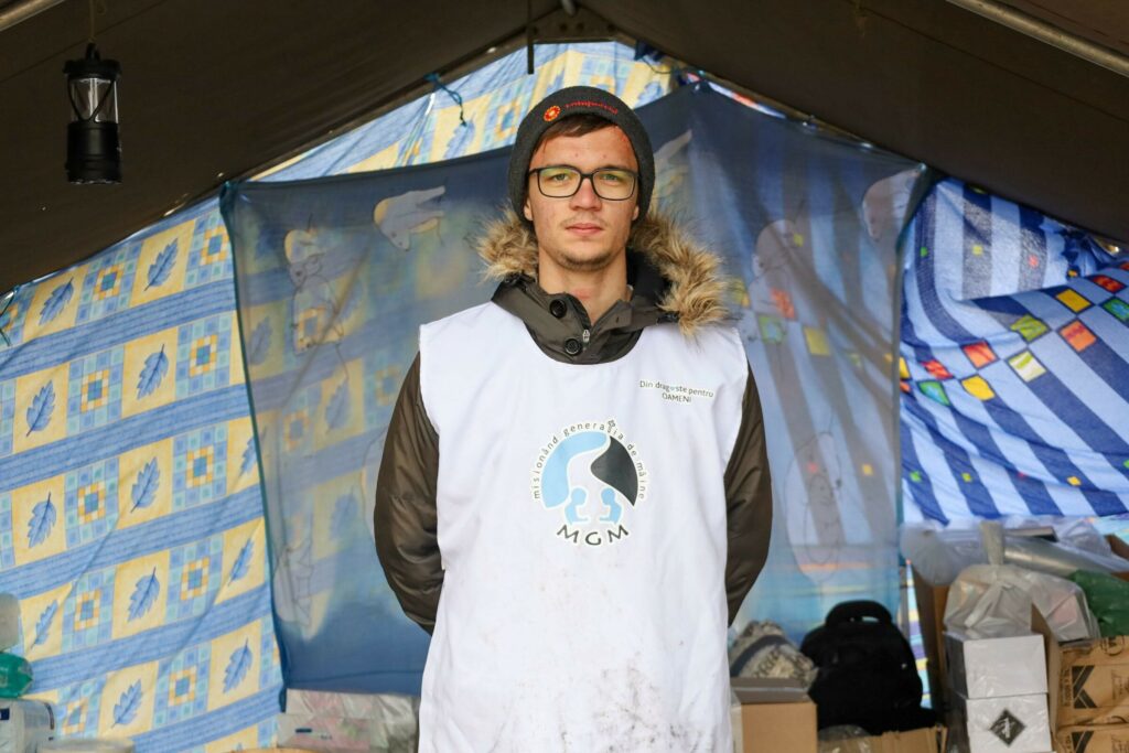 I en af madboderne står 24-årige Aurelis, der arbejder for en rumænske hjælpeorganisation, som forsøger at hjælpe ukrainerne.