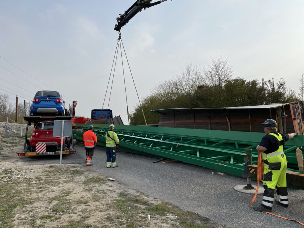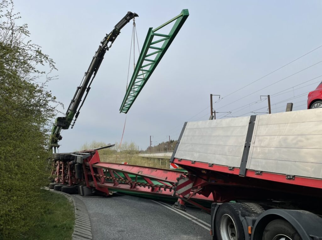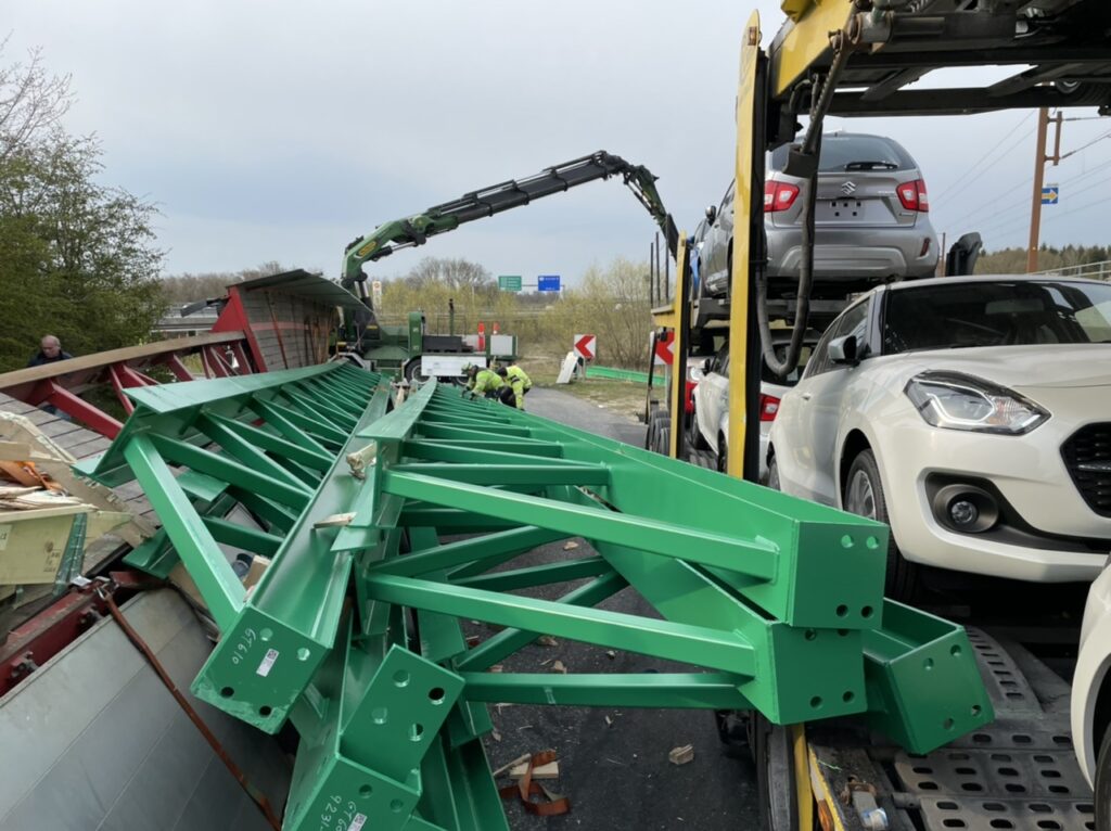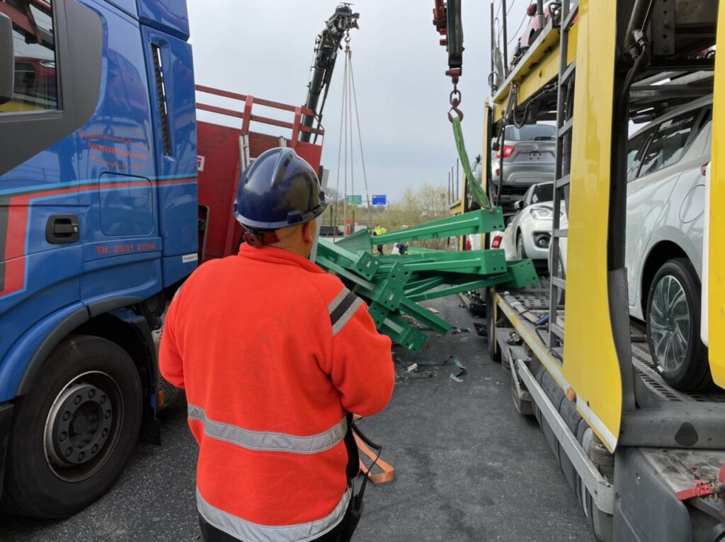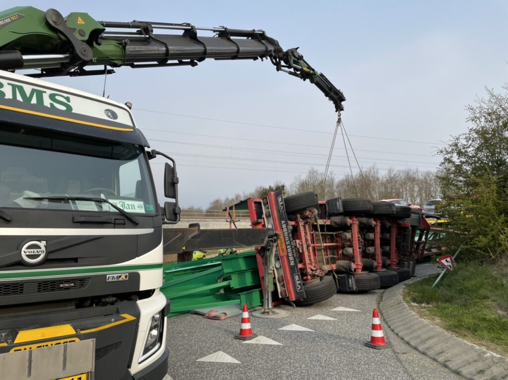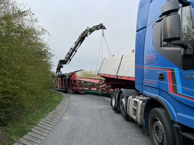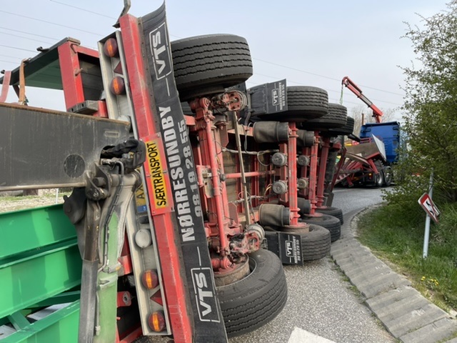 Under et skarpt sving kom bagerste hjulpar ud i rabatten, hvilket fik lastbilens trailer til at vælte og tabe et stort læs jerndragere ind i en parkeret autotransport.