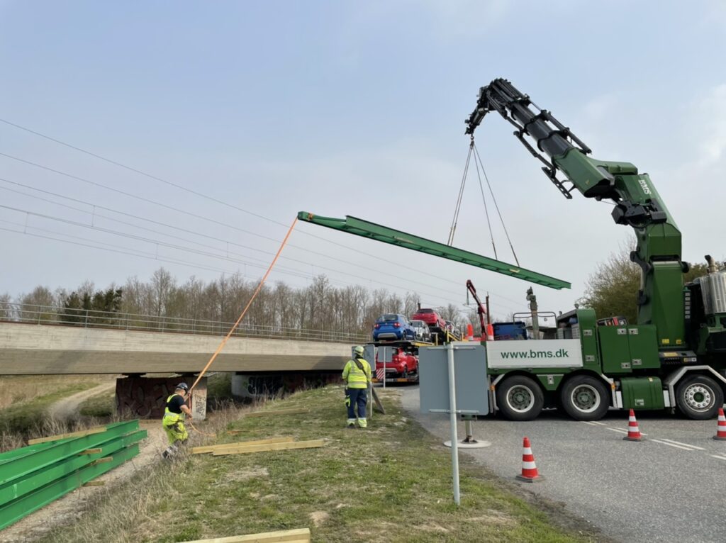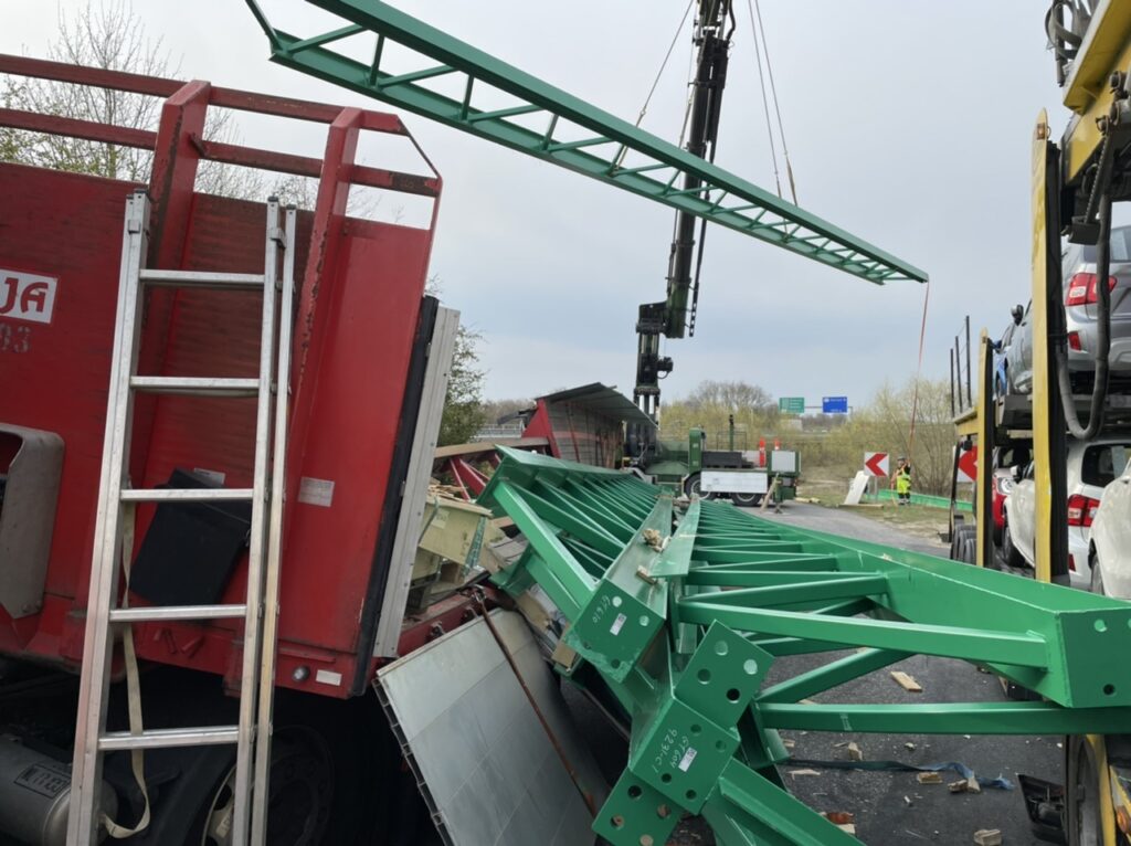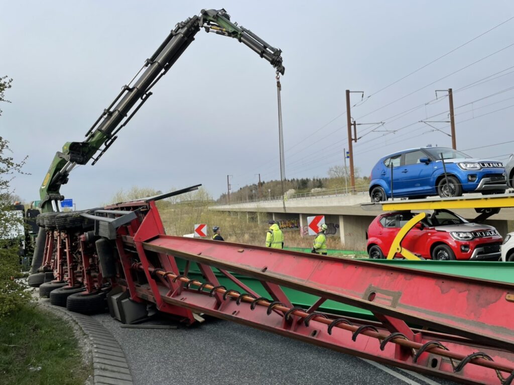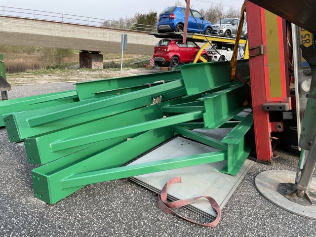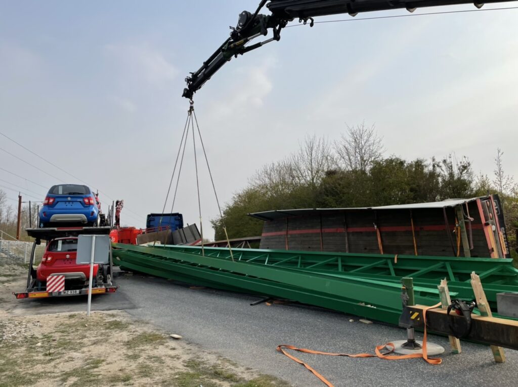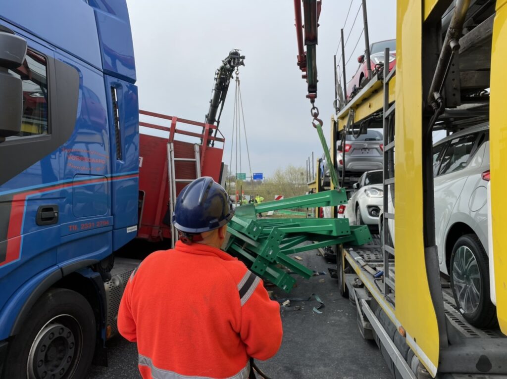 Under et skarpt sving kom bagerste hjulpar ud i rabatten, hvilket fik lastbilens trailer til at vælte og tabe et stort læs jerndragere ind i en parkeret autotransport.
