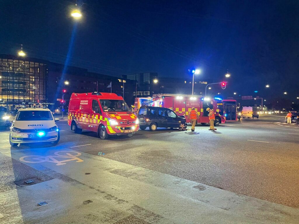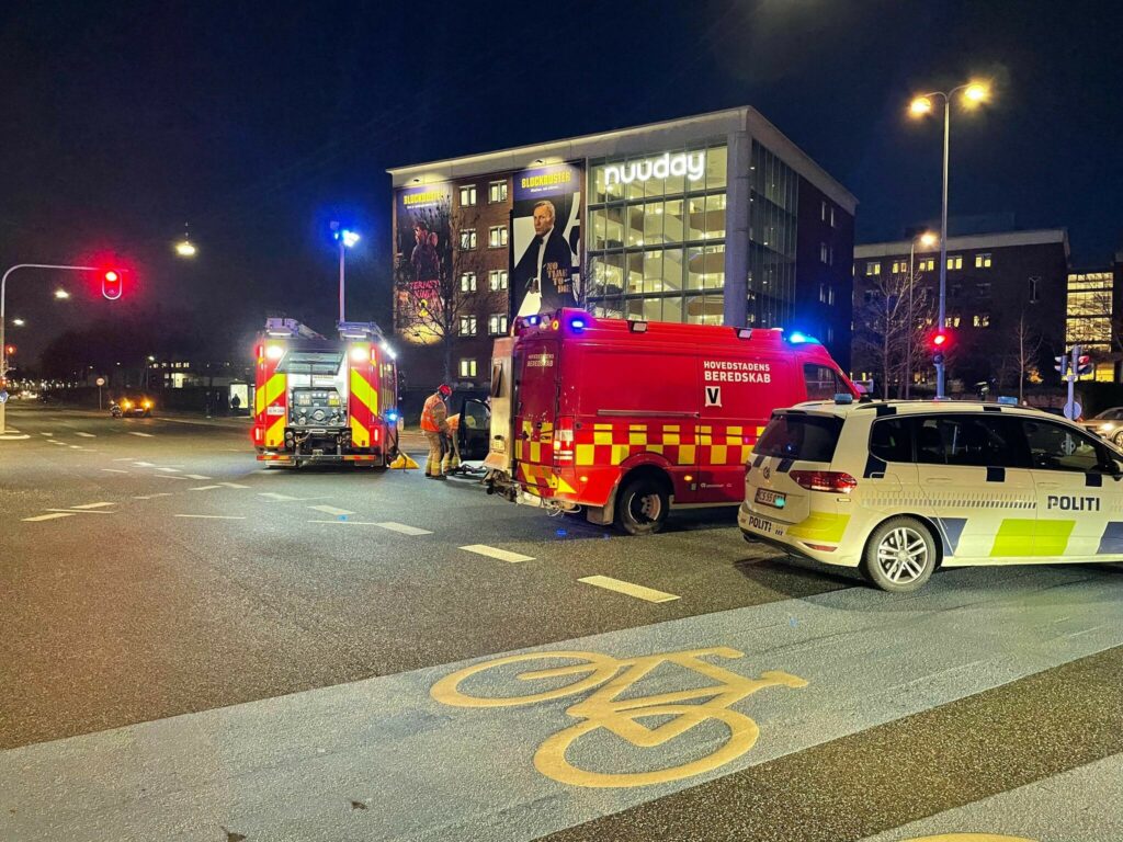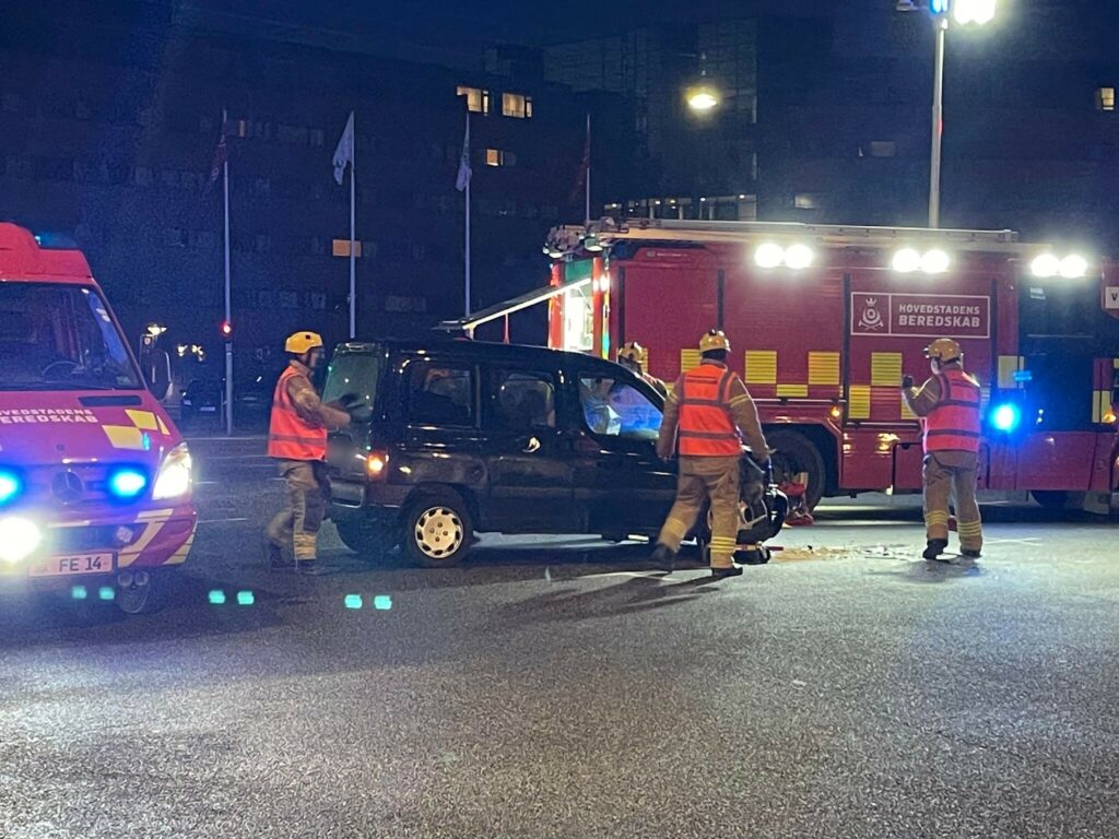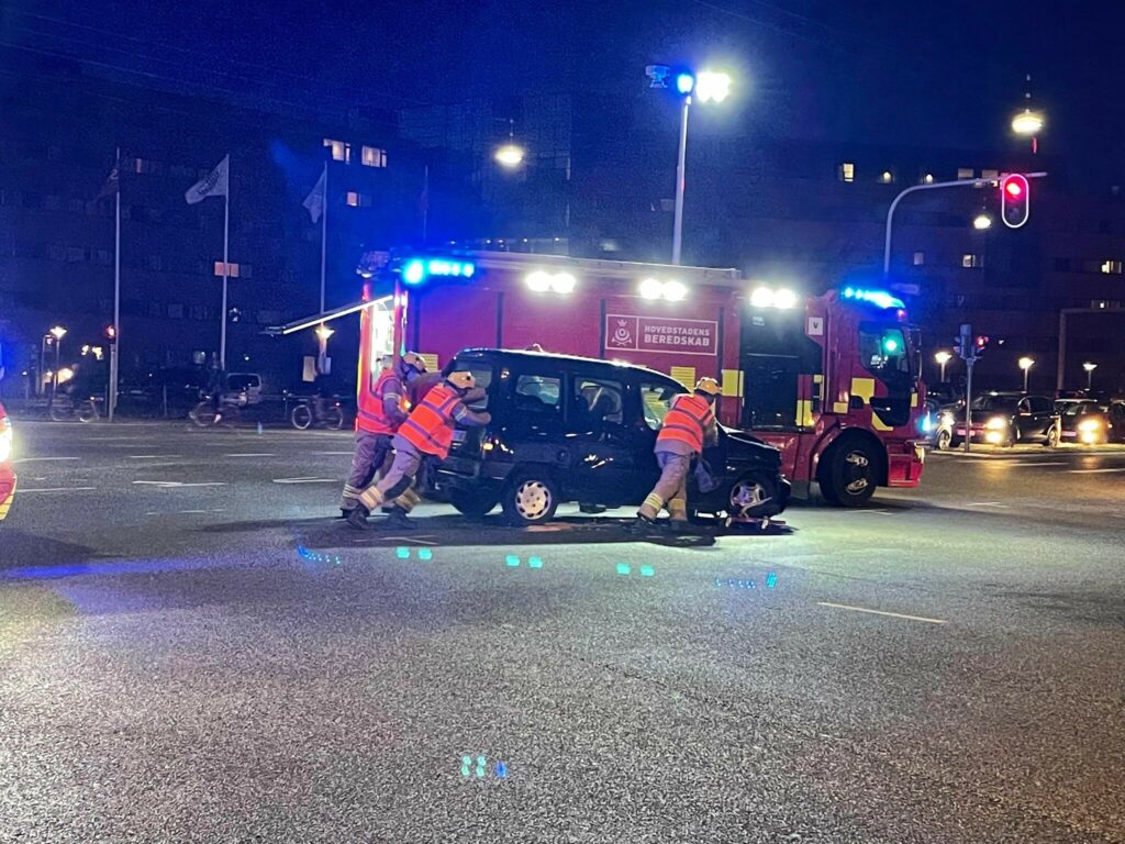 Hovedstadens Beredskab arbejder nu på at fjerne den ene bil fra det trafikkerede kryds.