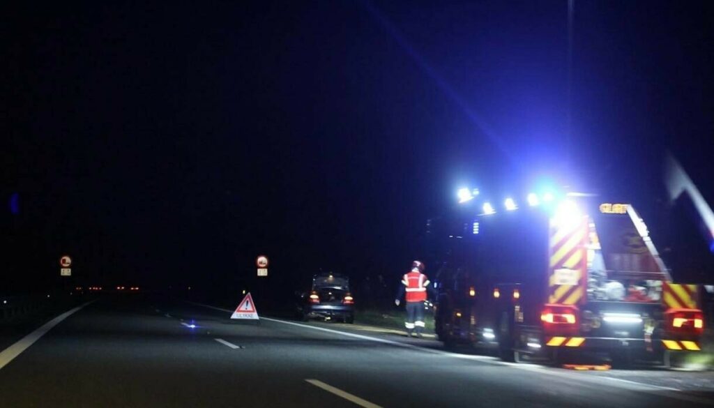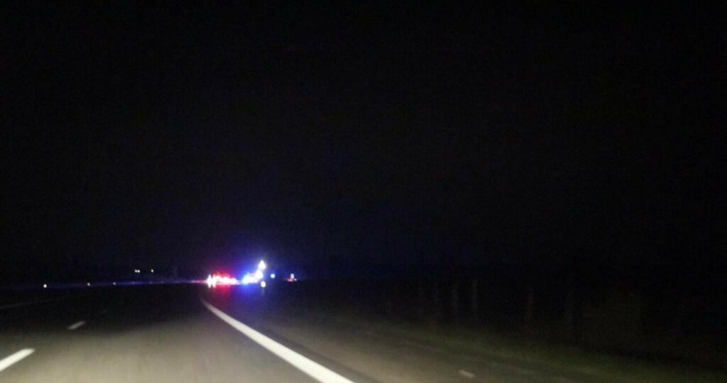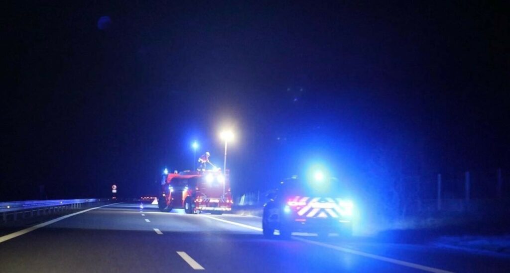 “E20 Esbjergmotorvejen, fra Vejen mod Kolding V mellem Vejen Ø <67> og Lunderskov <66>.Havareret bil i nødsporet, bil i brand, politi og redningsmandskab er på vej.”