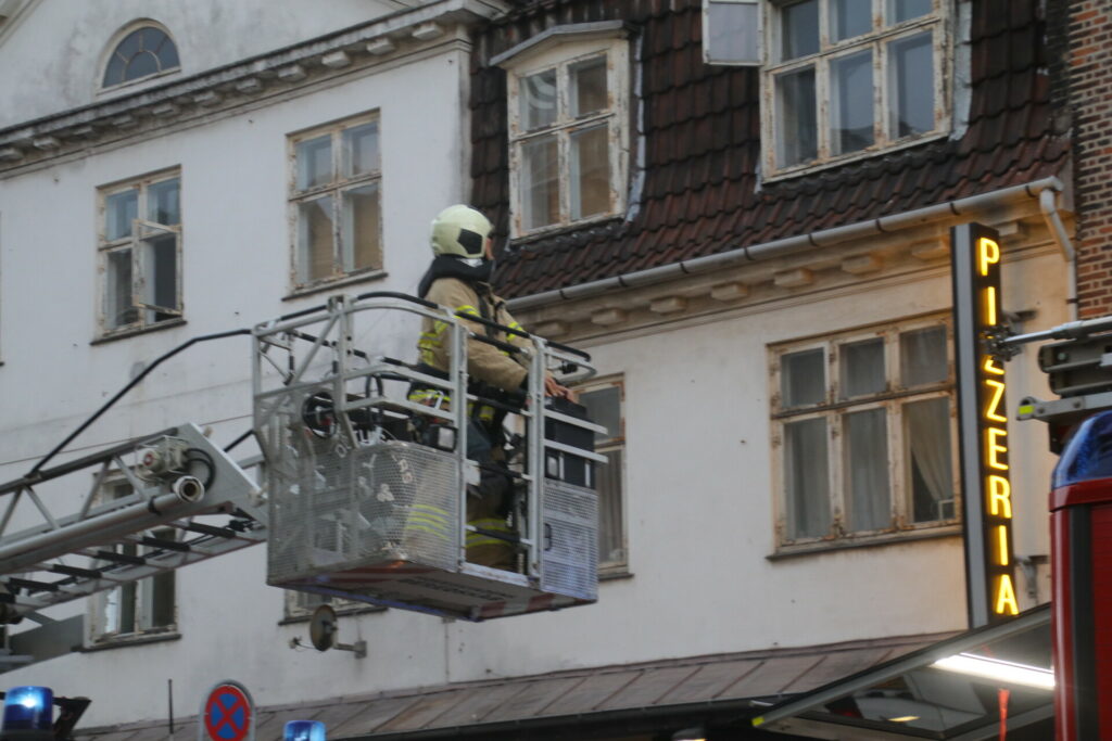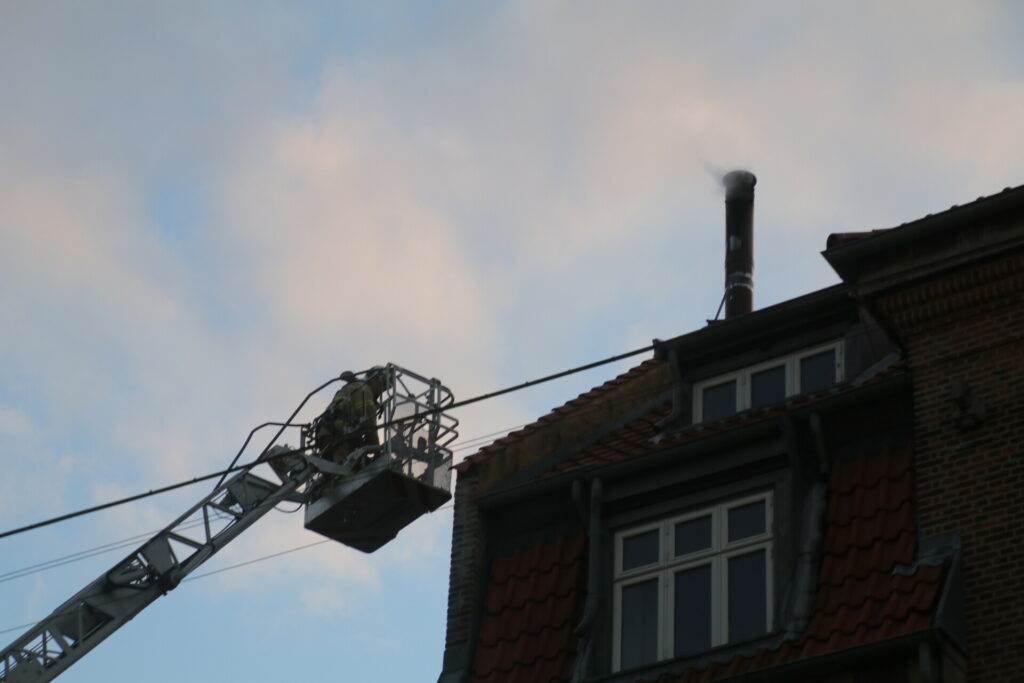 Brandvæsenet er i gang med slukningsarbejdet på stedet som blandt andet består i at rense skorstenen igennem.
