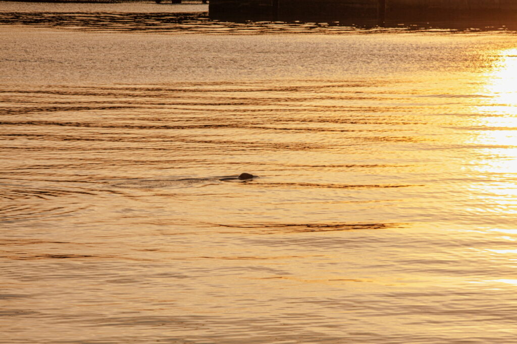 I havnen svømmede en legesyg sæl og lignede at den nød aftenens solnedgang.