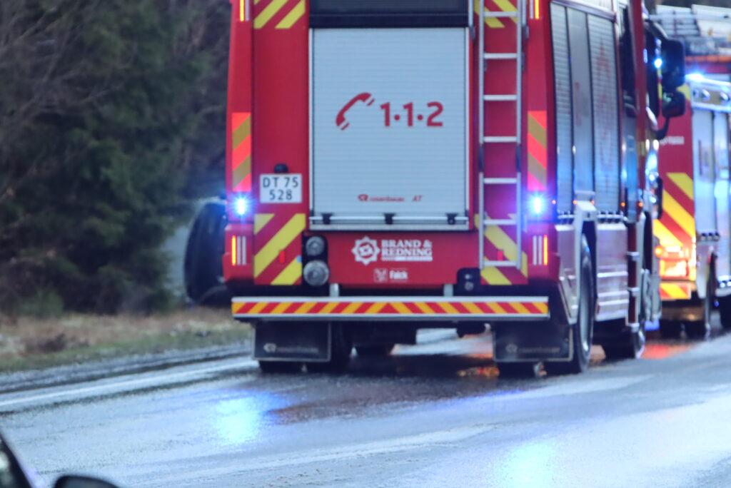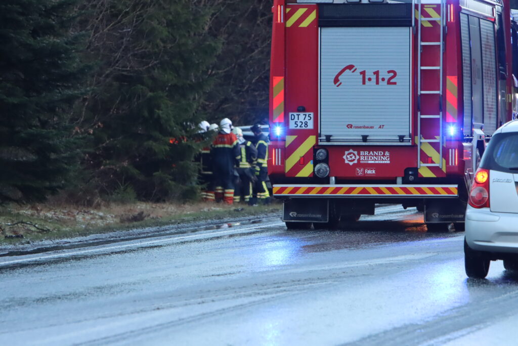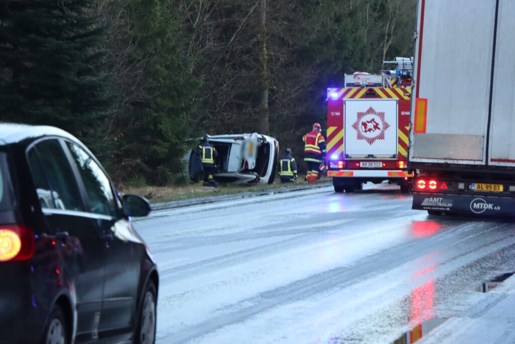 Bilen er væltet ind i grøften, hvor den ligger på siden.