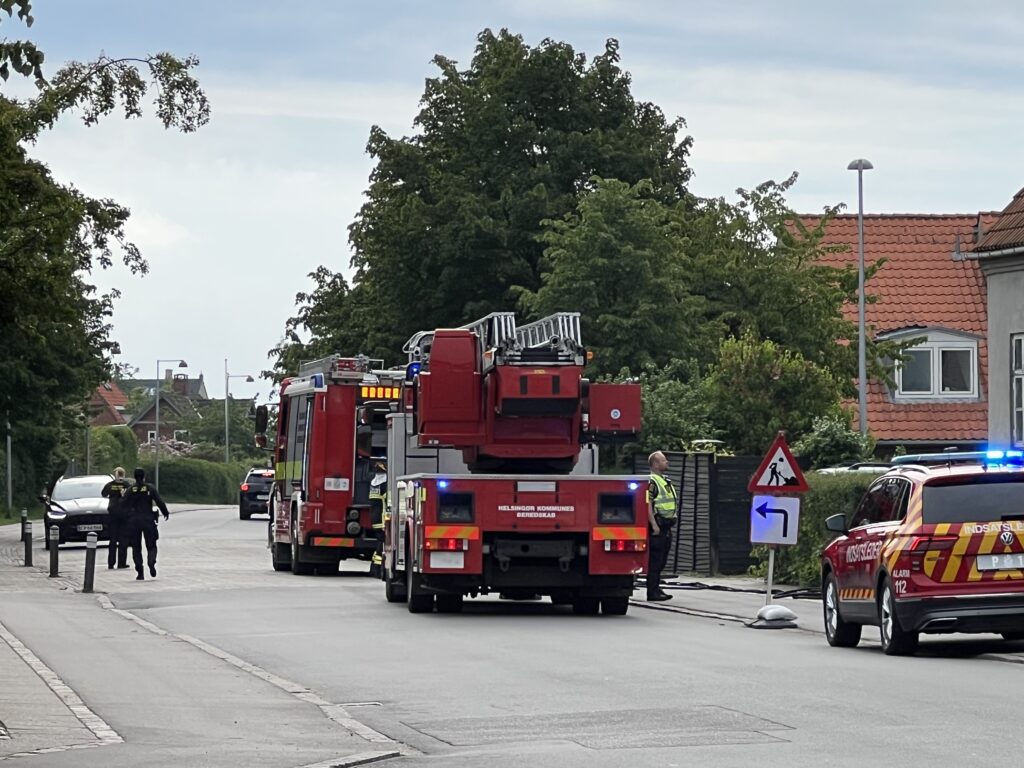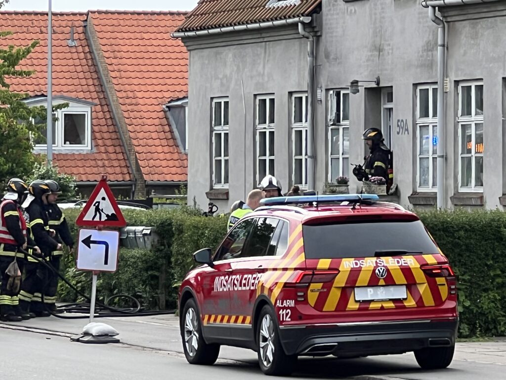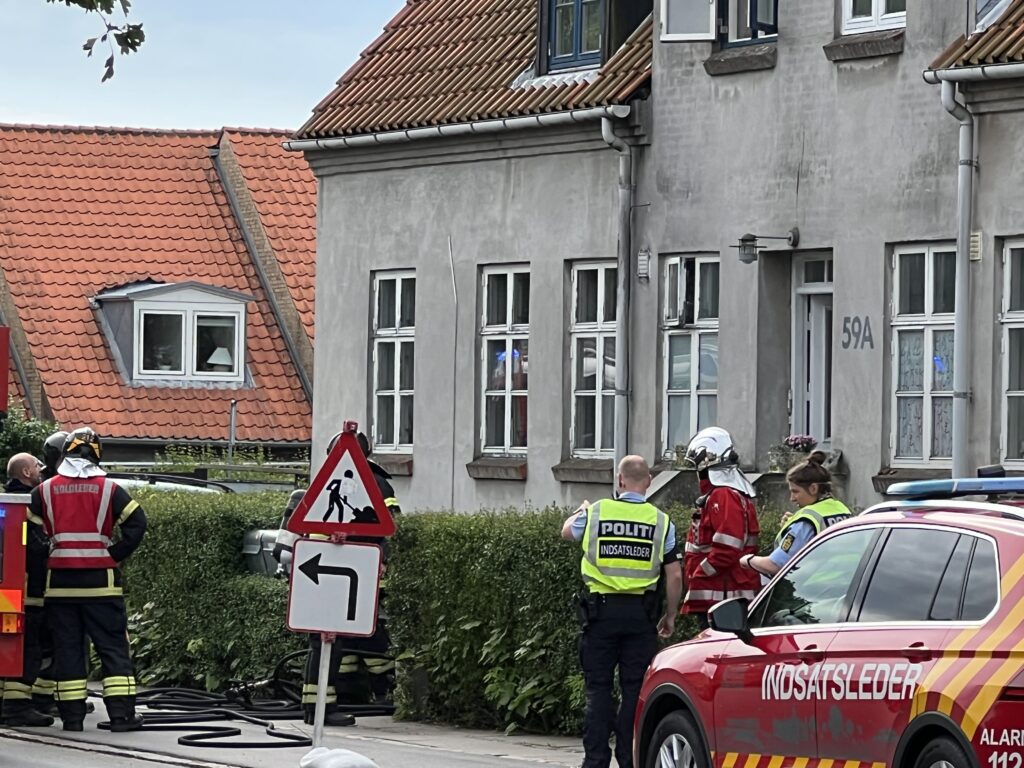 Flere redningskøretøjer samt politibiler var fremme på stedet, hvor slukningsarbejdet hurtigt var i gang.
