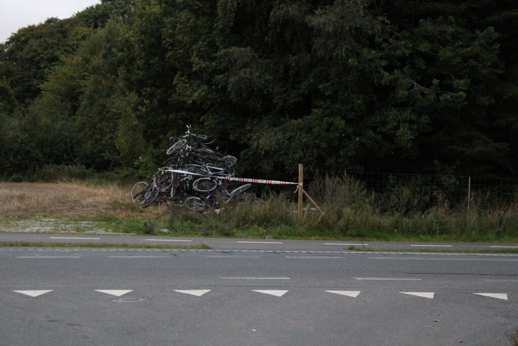 En større bunke cykler er fredag morgen fundet efterladt på Daubjergvej ved Hedensted.