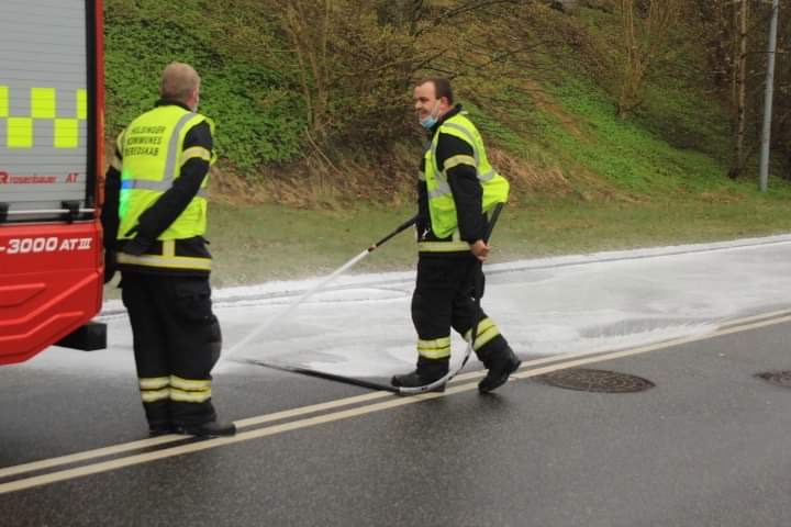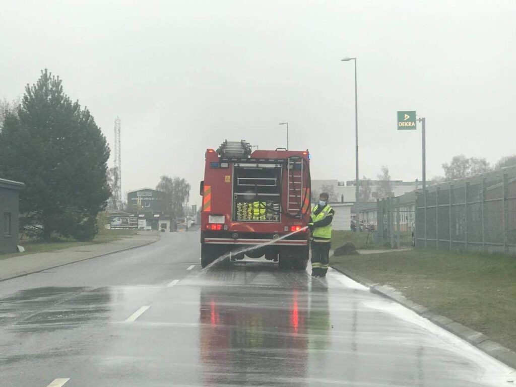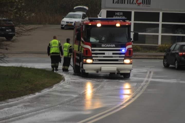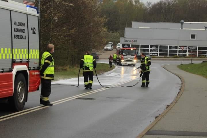 Et køretøj har tabt en større mængde brændstof på vejen, som har gjort at Helsingør beredskab, måtte ud og spule vejene rene.