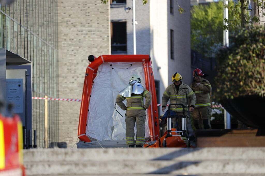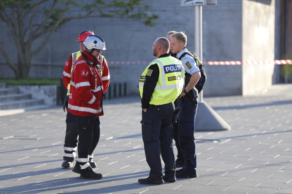 Et større område er afspærret mens politi og brandvæsen arbejder på stedet.