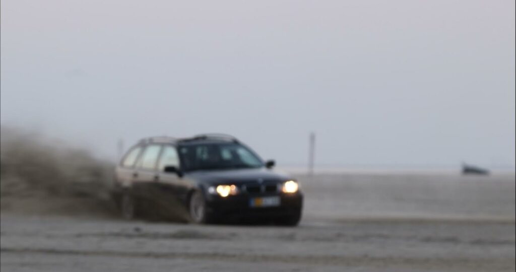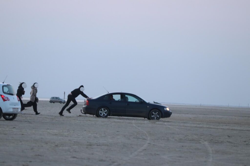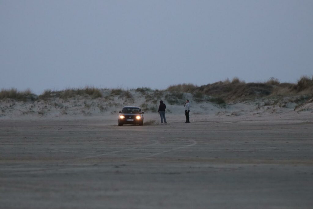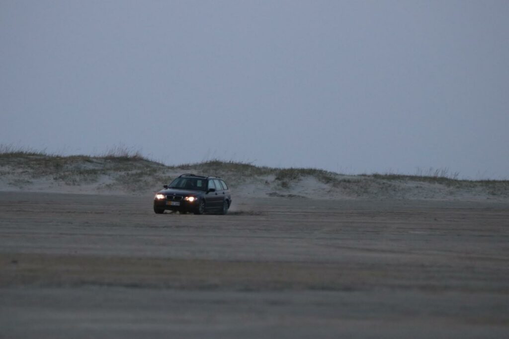 Flere biler er på stedet, og der køres ræs, rundt på stranden.