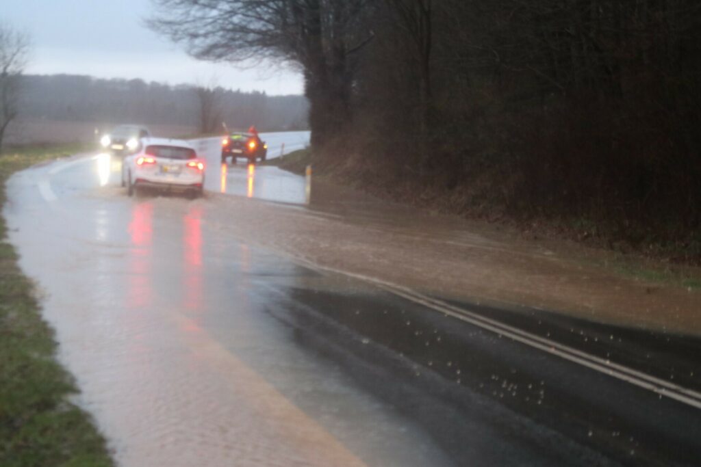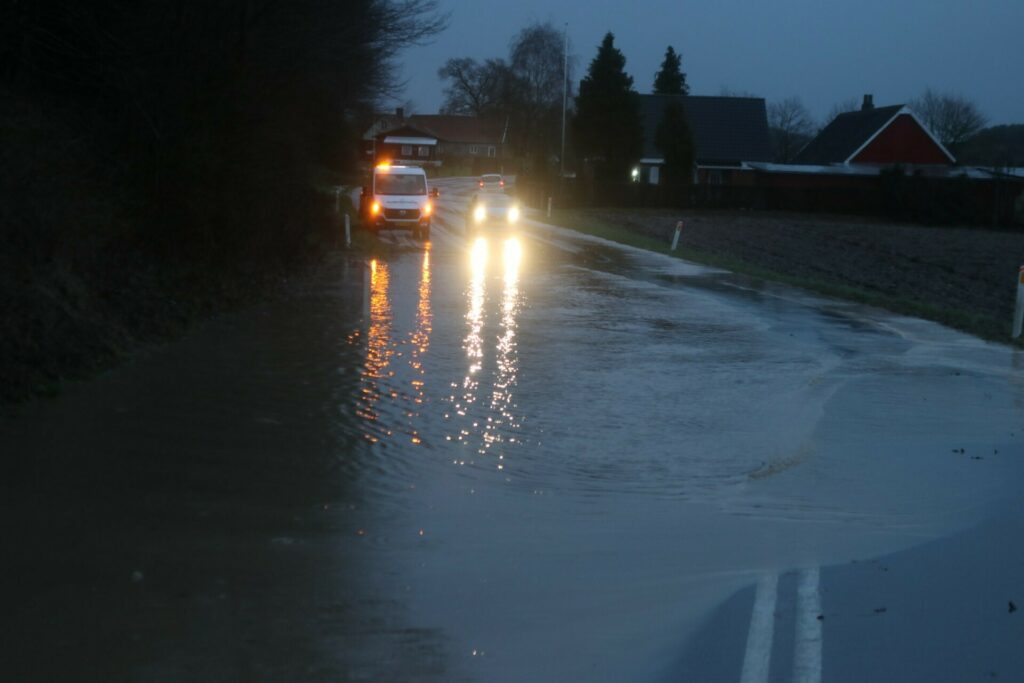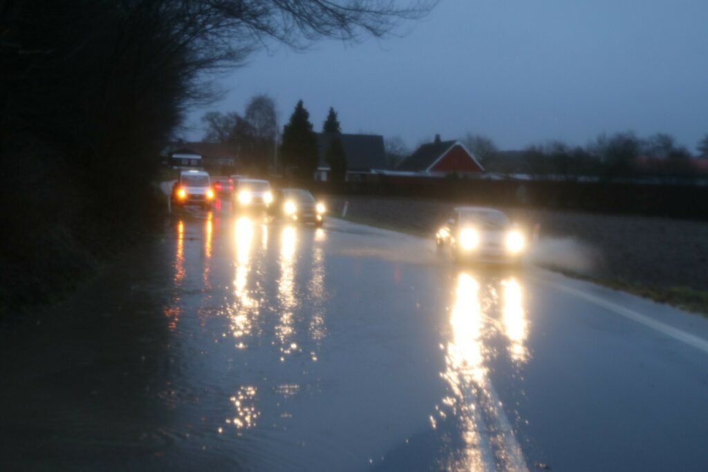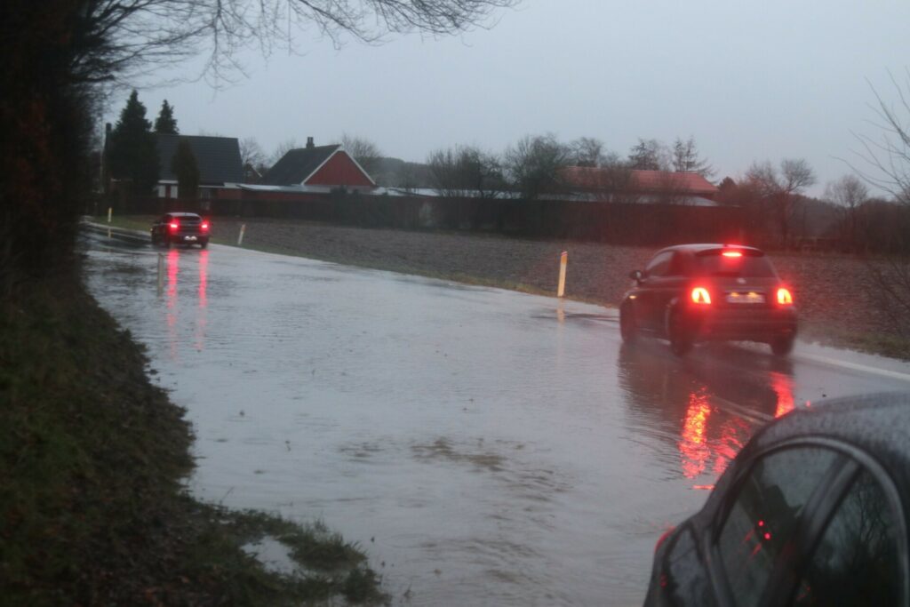 Det skyldes, at der på stedet har samlet sig meget vand i svinget, hvilket har været grunden til, at mindst én bil tidligere på eftermiddagen sad fast i svinget.
