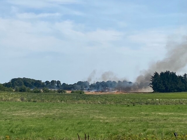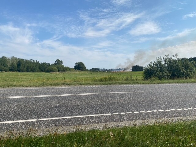 Der er ikke nogen personskader, men formentlig en mejetærsker, der er skyld i branden, oplyser vagthavende hos Trekantbrand.