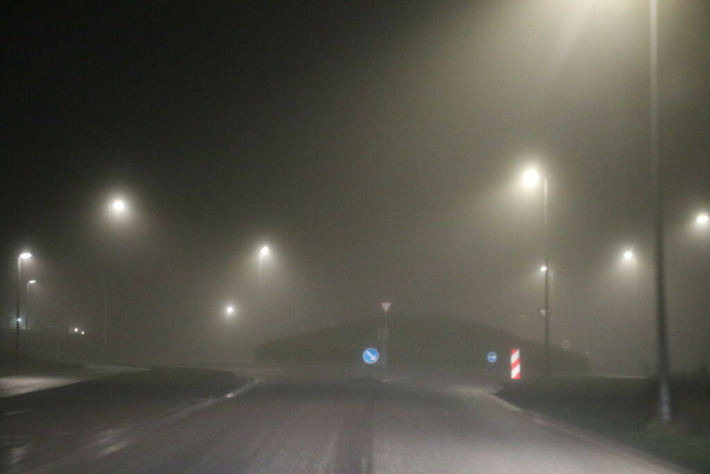 En tyk tåge ligger torsdag morgen tæt indover Fyn.