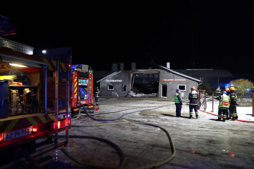 Omkring 20 brandfolk har kæmpet med flammer i et autoværksted, som er endt med at udbrænde