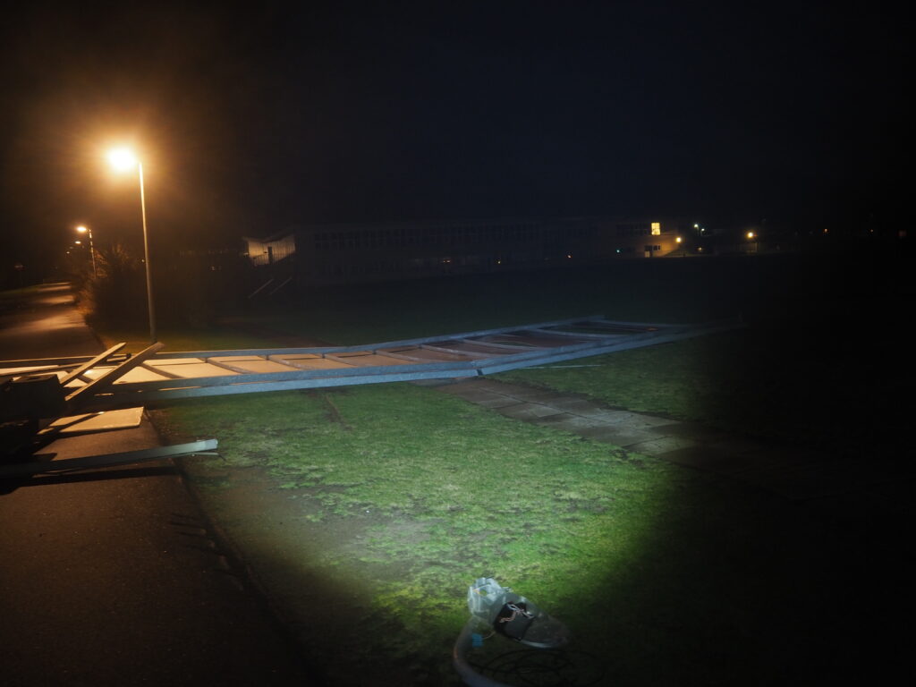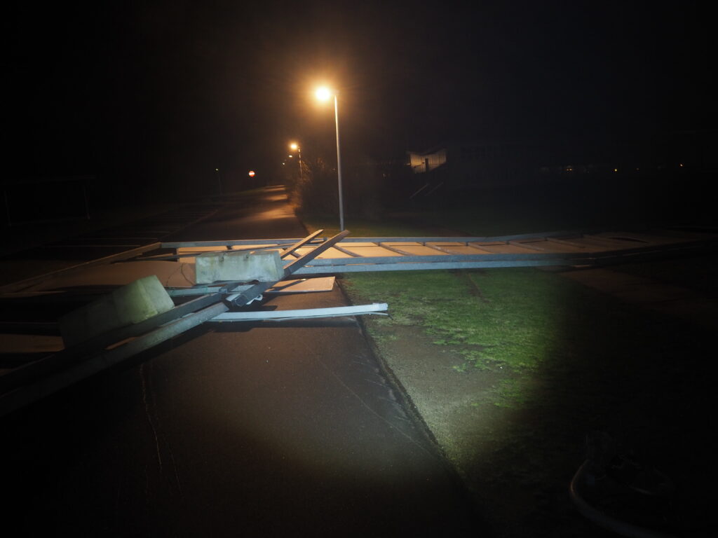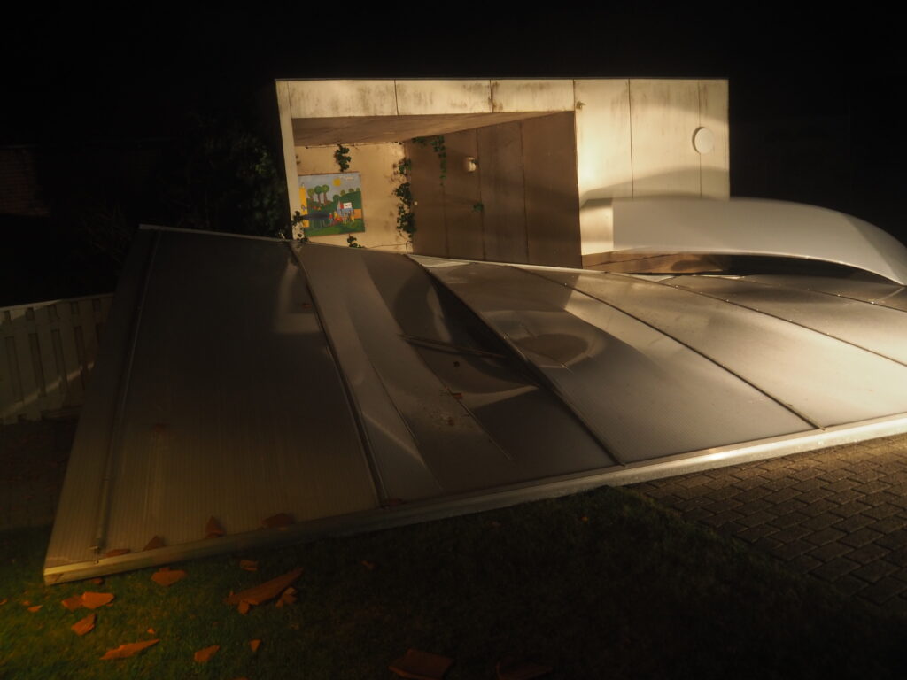Tagende er blæst af og ligger på modsatte side af vejen.