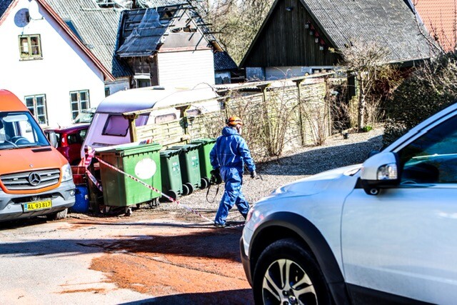 Teknikkere er søndag middag til stede på Hyldebjergvænget i Hvalsø, hvor en brand natten til søndag kostede én person livet.