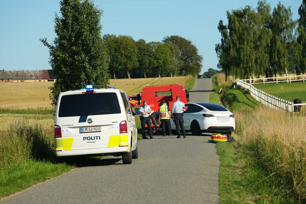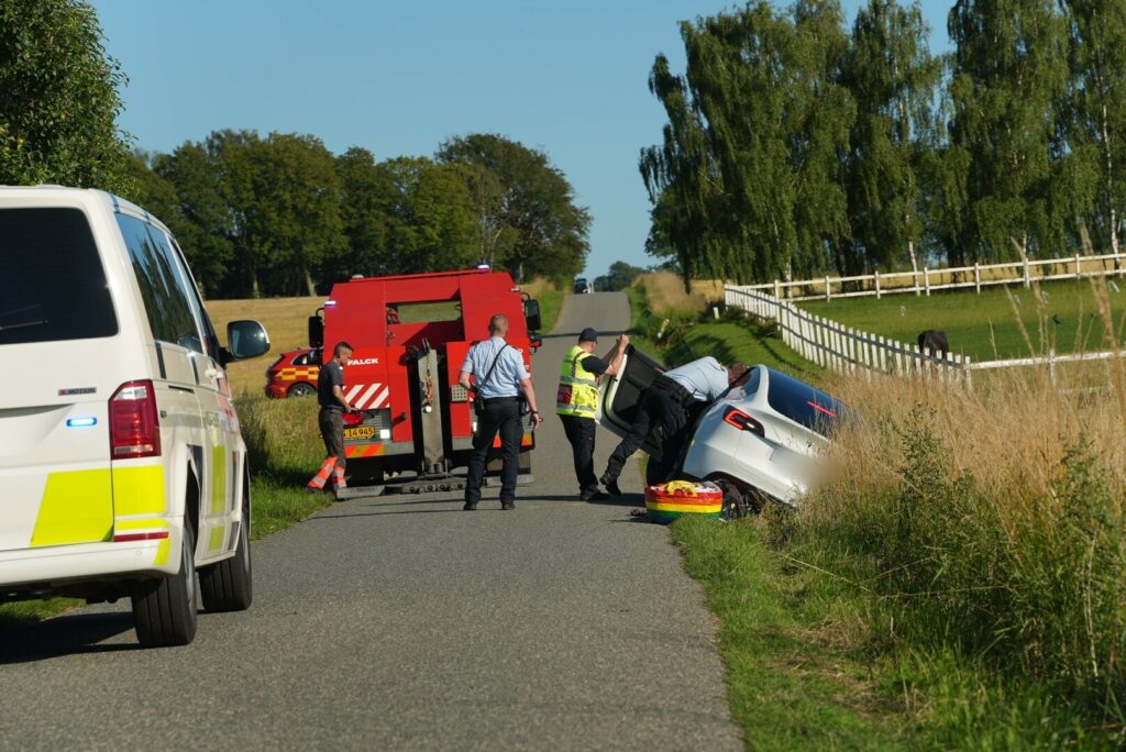 En Tesla er netop drønet i grøften langs Houstrupvej i den lille by Stouby lige nord for Fredericia.