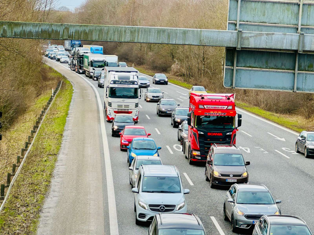 Ifølge Vejdirektoratet strækker køen sig omkring klokken 14.45 i ti kilometer og starter omkring Kolding.