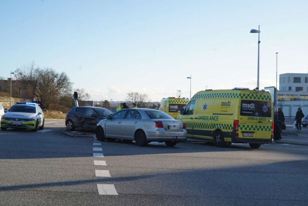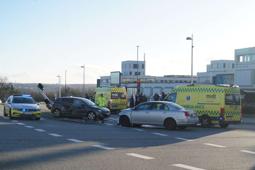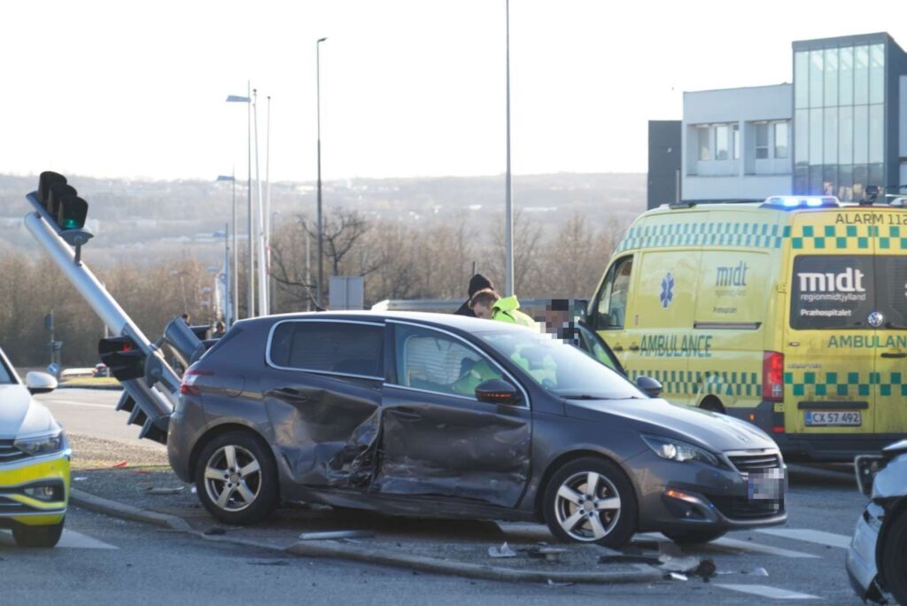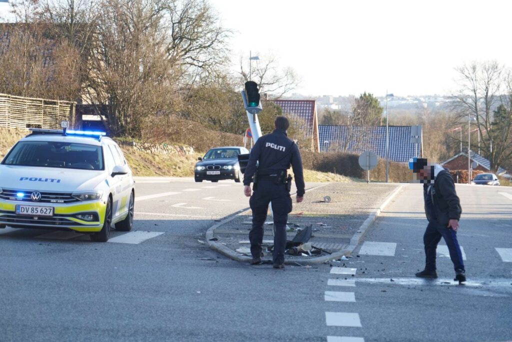Under sammenstødet har den ene bil ramt den anden i siden og er fortsat over i et lyssignal, der er væltet.