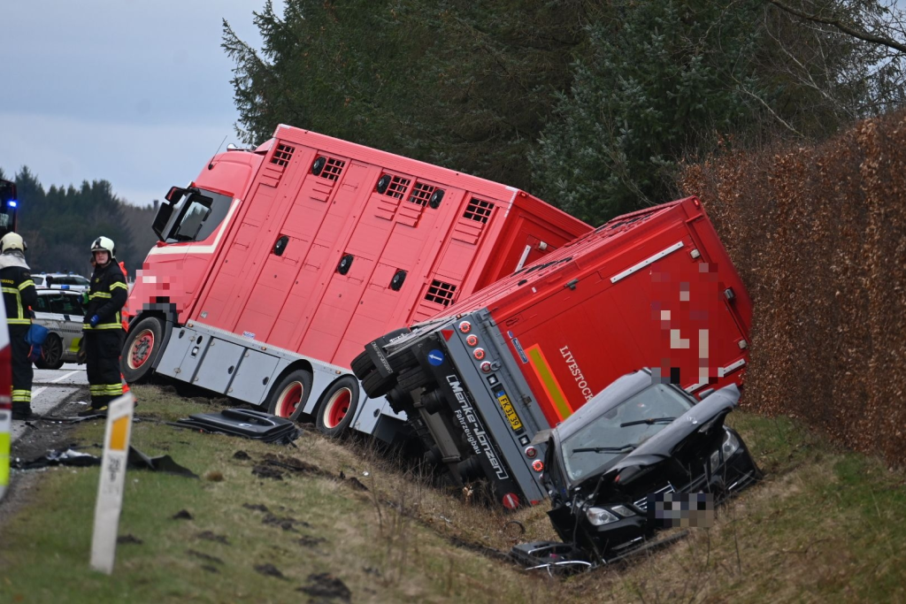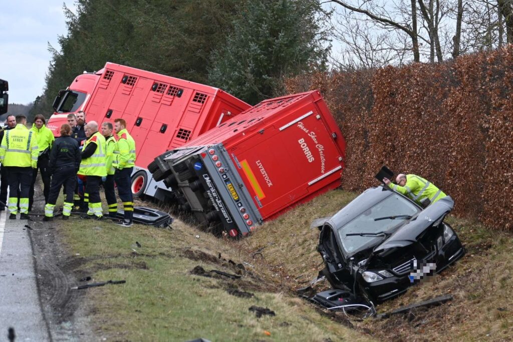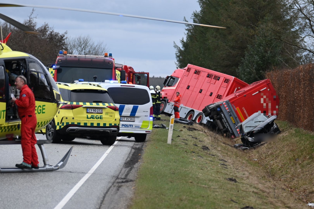 En grisetransport er mandag eftermiddag kørt ind i en personbil på en landevej. Nu meldes en mand og kvinde i kritisk tilstand