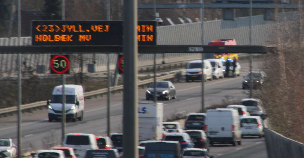 Mandag eftermiddag er der sket et færdselsuheld på motorvejen, hvor to spor var blevet spærret. Både ambulance og brandkøretøjer er på stedet og det giver en massiv kø på strækningen.