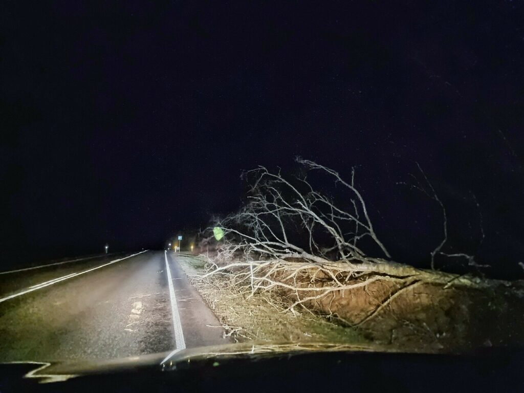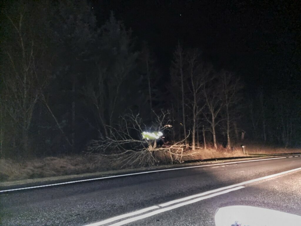 Der er væltet et træ i kanten af vejen ved på Frederikshavnsvej nær Hørmestee ved Sindal. Det er markeret med en refleksvest.