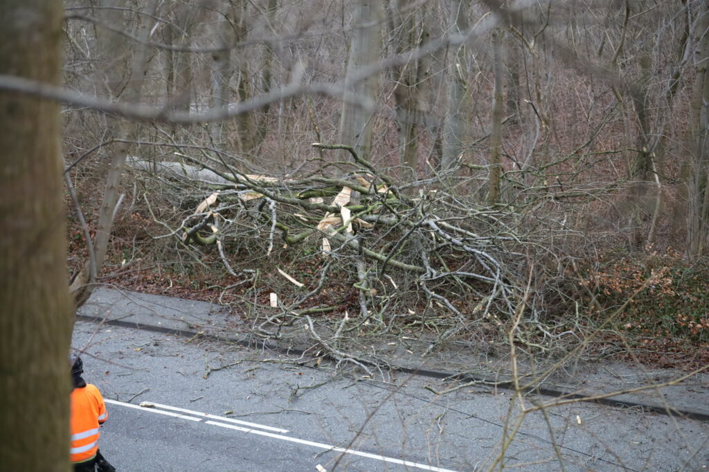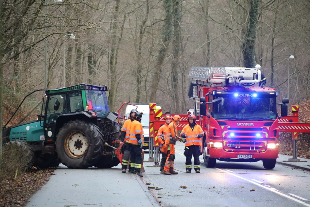 Trekantbrand er lørdag til stede i Kolding, hvor et stort træ er væltet ud over vejen.