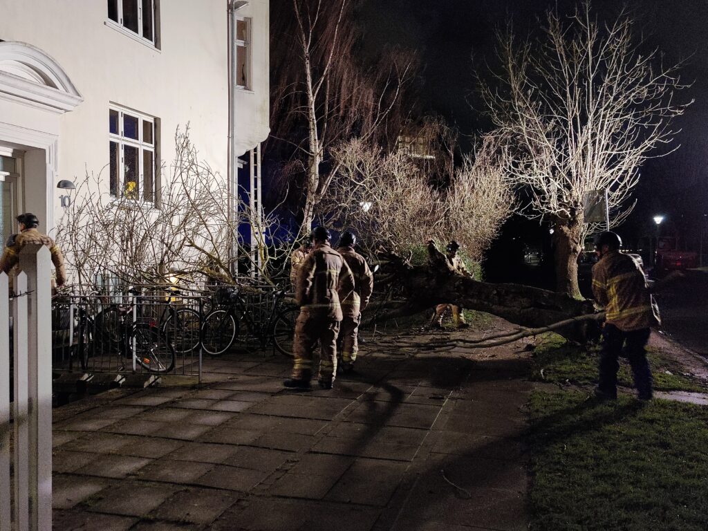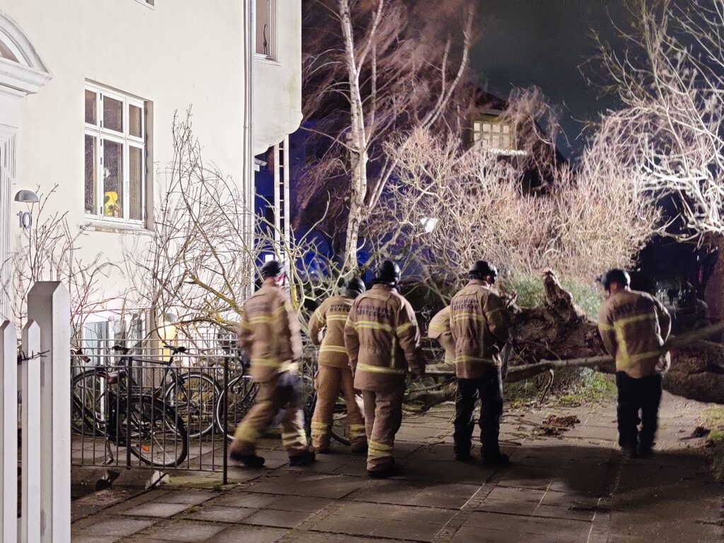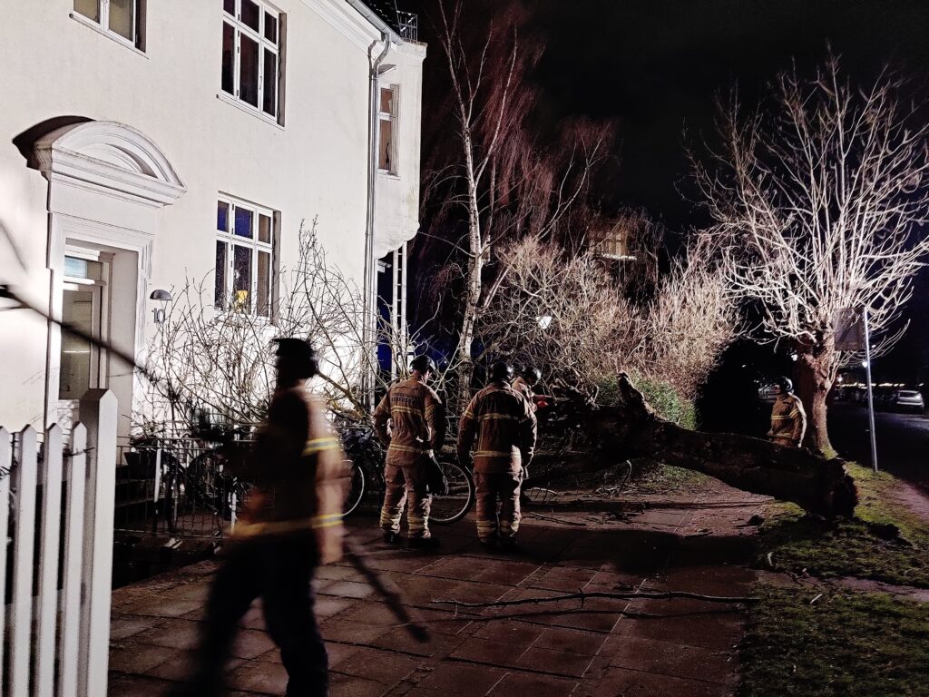 Brandvæsnet er lørdag til stede på Rebekkavej i Hellerup, hvor et træ er væltet ked ved en bygning.
