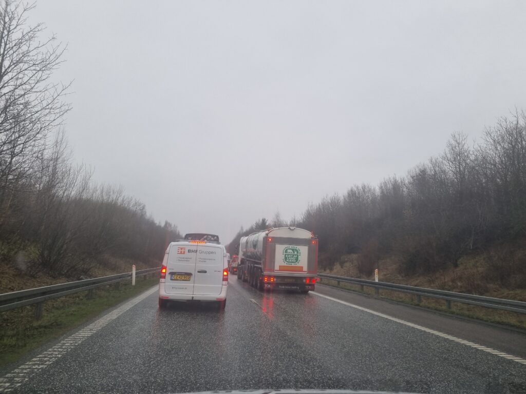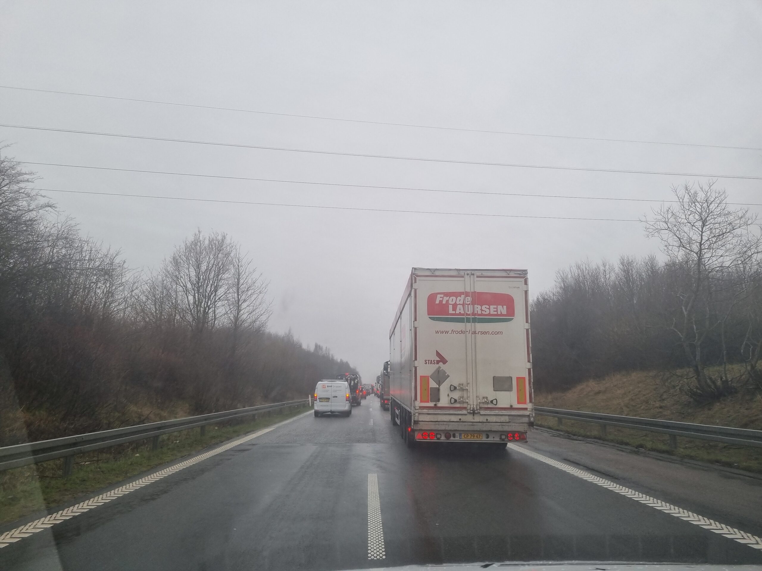 Direktoratet oplyser klokken 12, at der er opstået en kø på omkring fem kilometer. Bilister rammer køen omkring Herslev.
