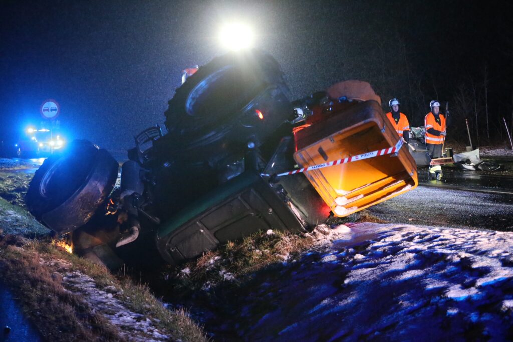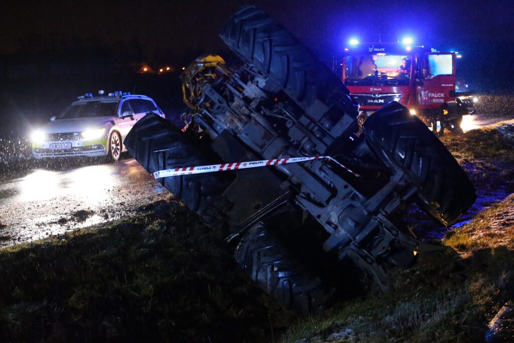 Redningsmandskabet er på stedet hvor traktoren er havnet på taget i grøften.