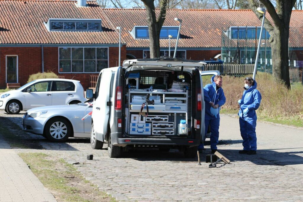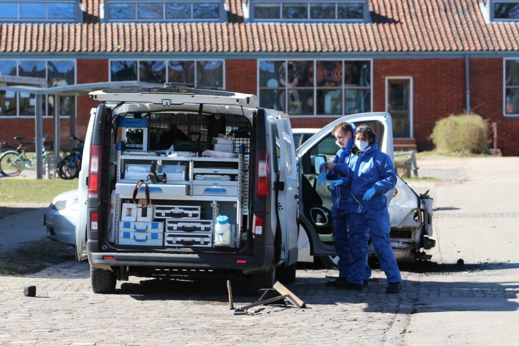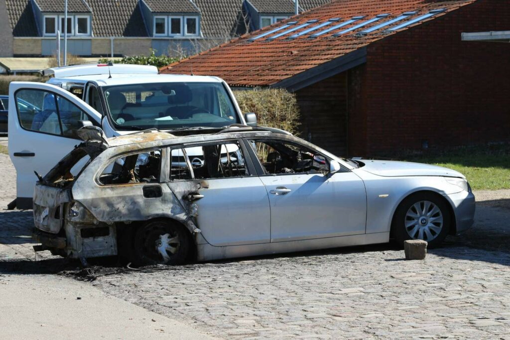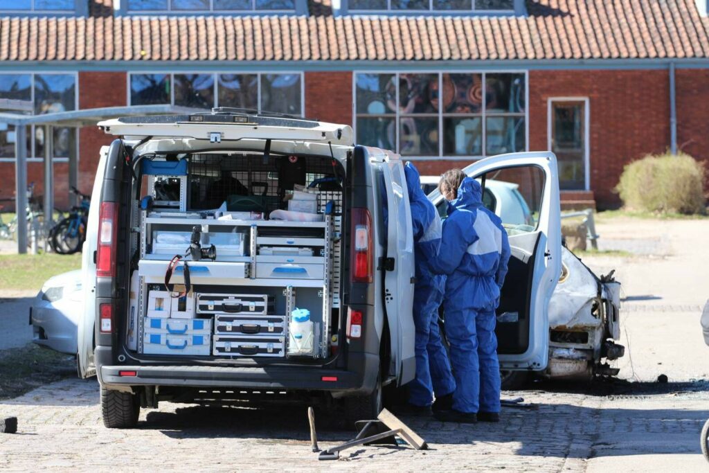 Flere teknikere er til stede ved den brændte bil. Det er endnu uvist, hvad der er årsagen til branden.