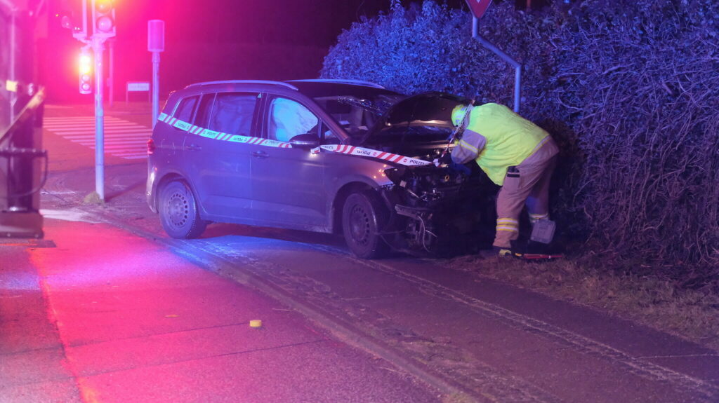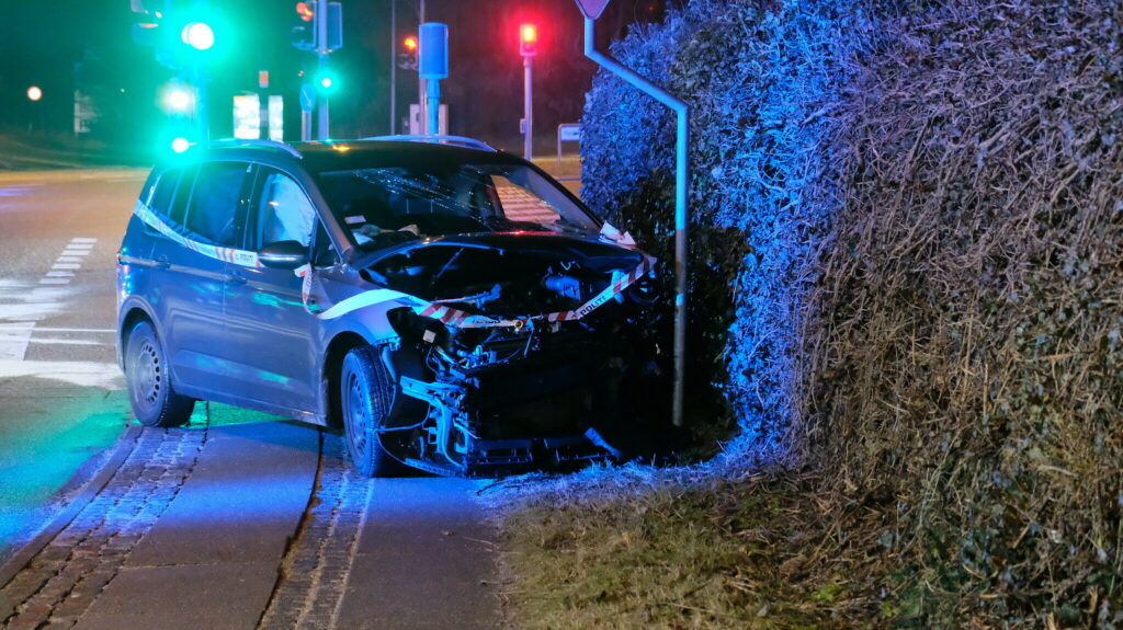 Her er en personbil kørt endt på fortovet med en smadret front.