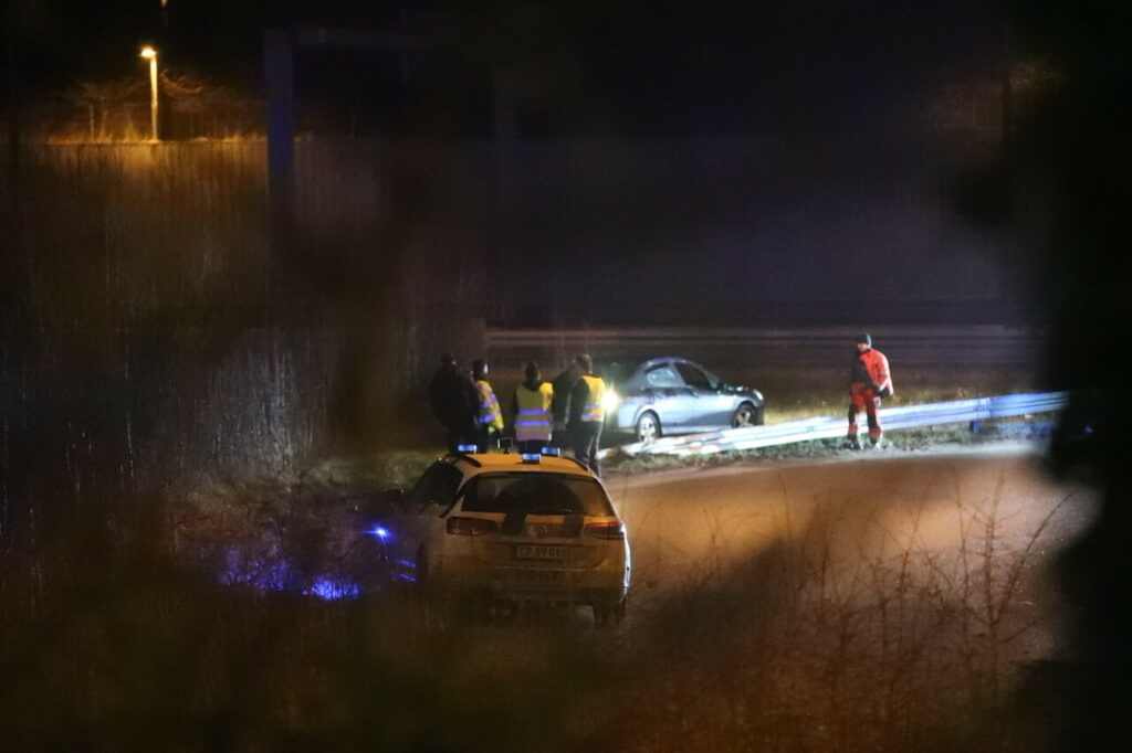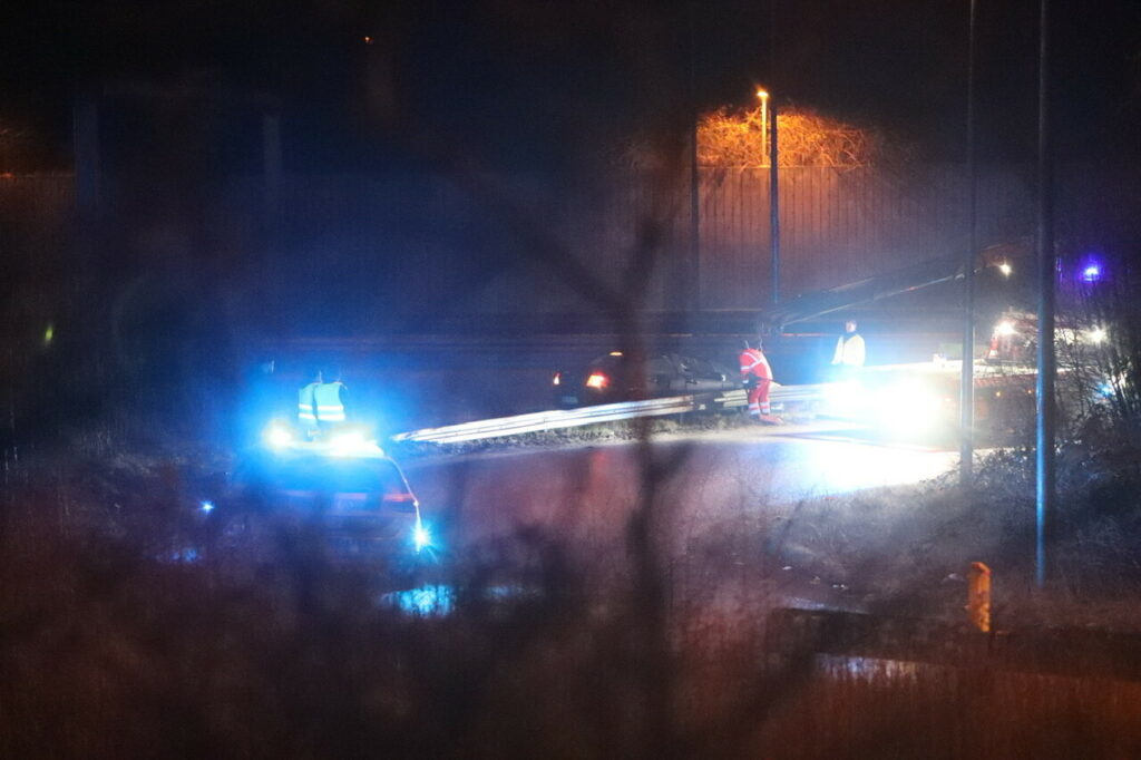 En personbil var røget ud over autoværnet og en autotransport var tilkaldt for at få den forulykkede bil fri igen. Også flere politipatruljer var på stedet.