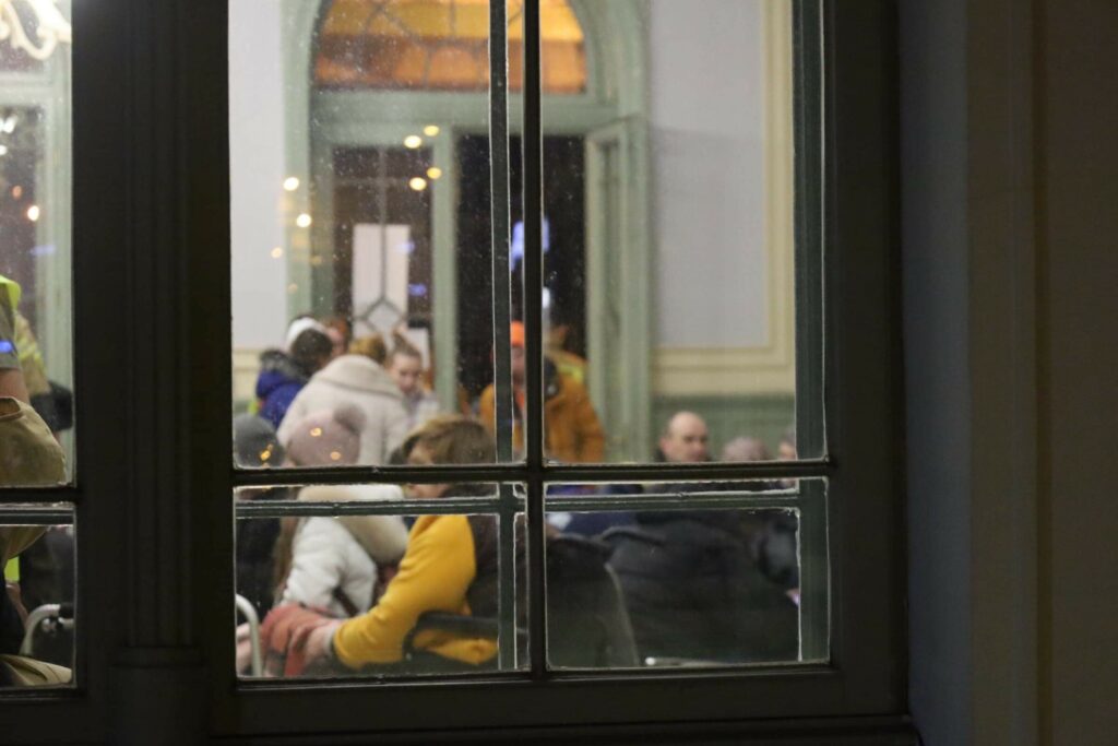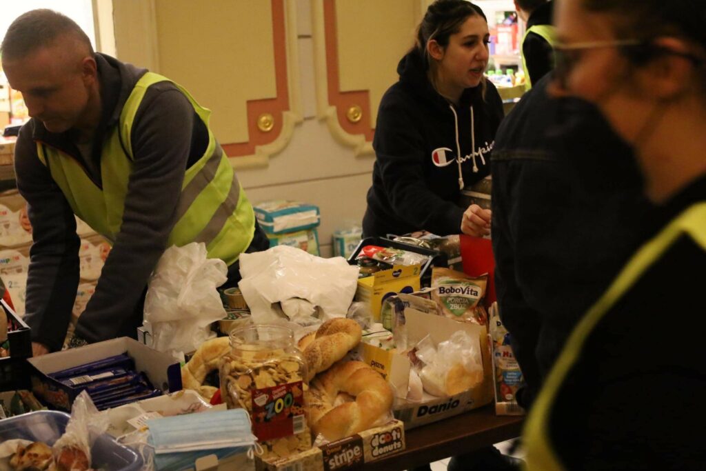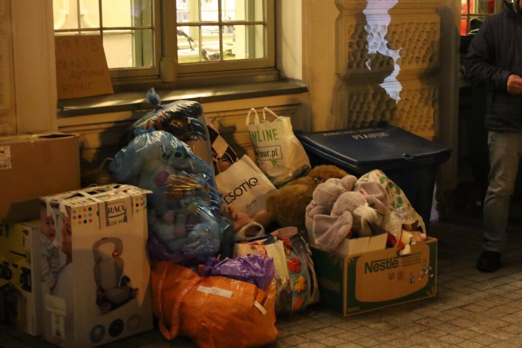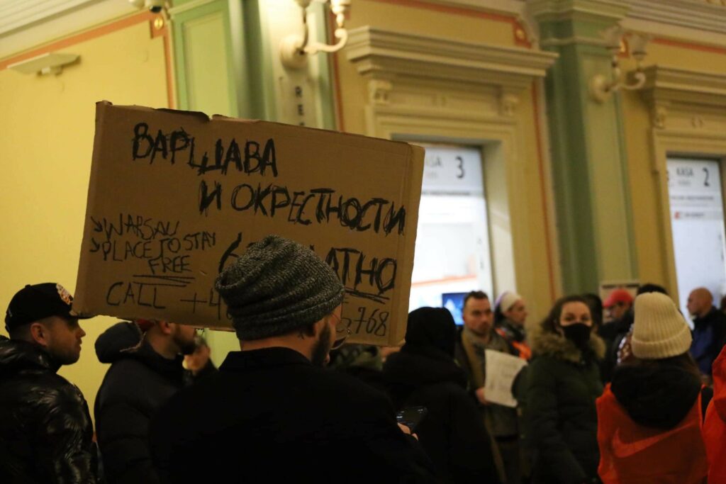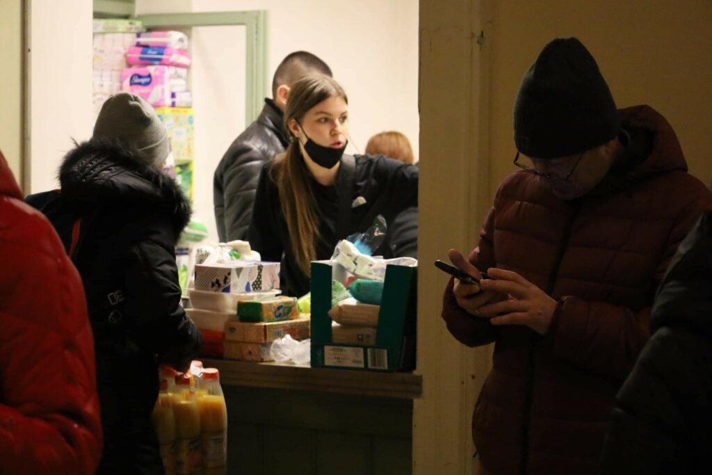 Folk stuver sig sammen på stationen med mad, drikke og bagage, efter at have flygtet fra et krigsramt Ukraine.