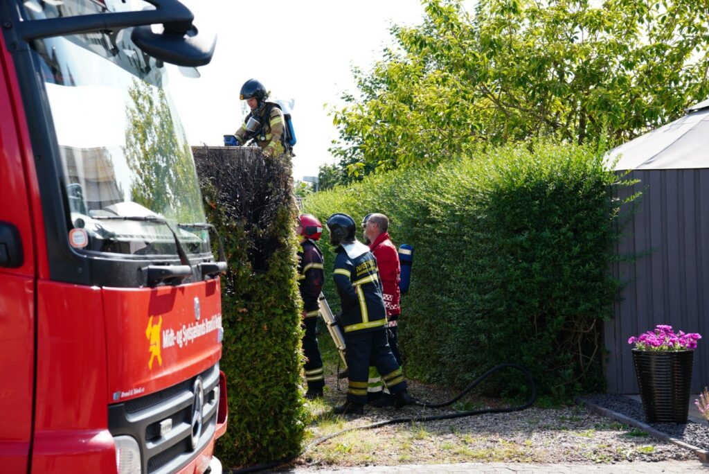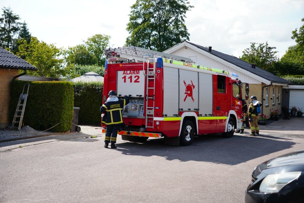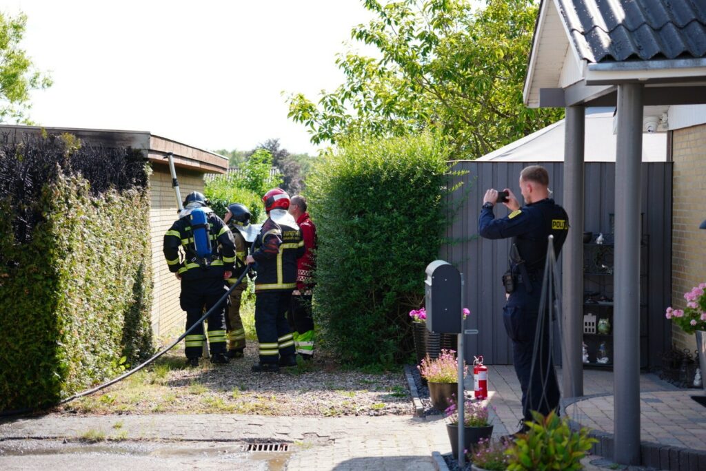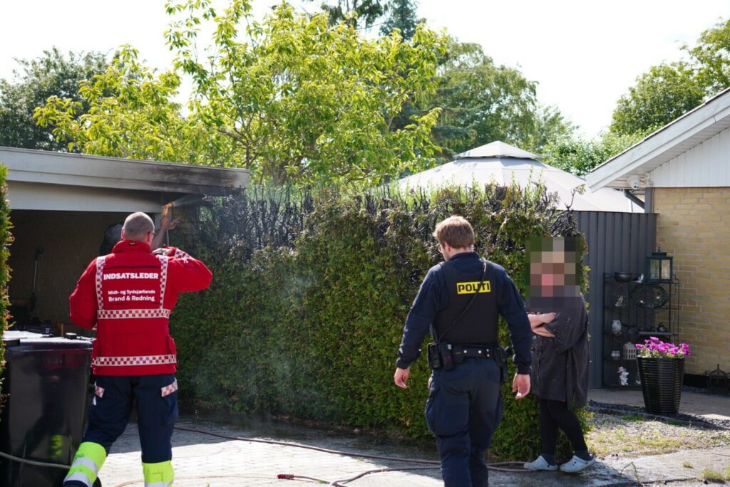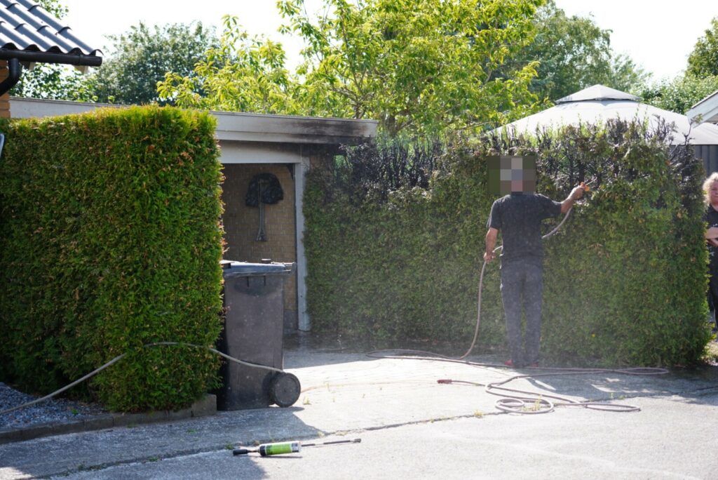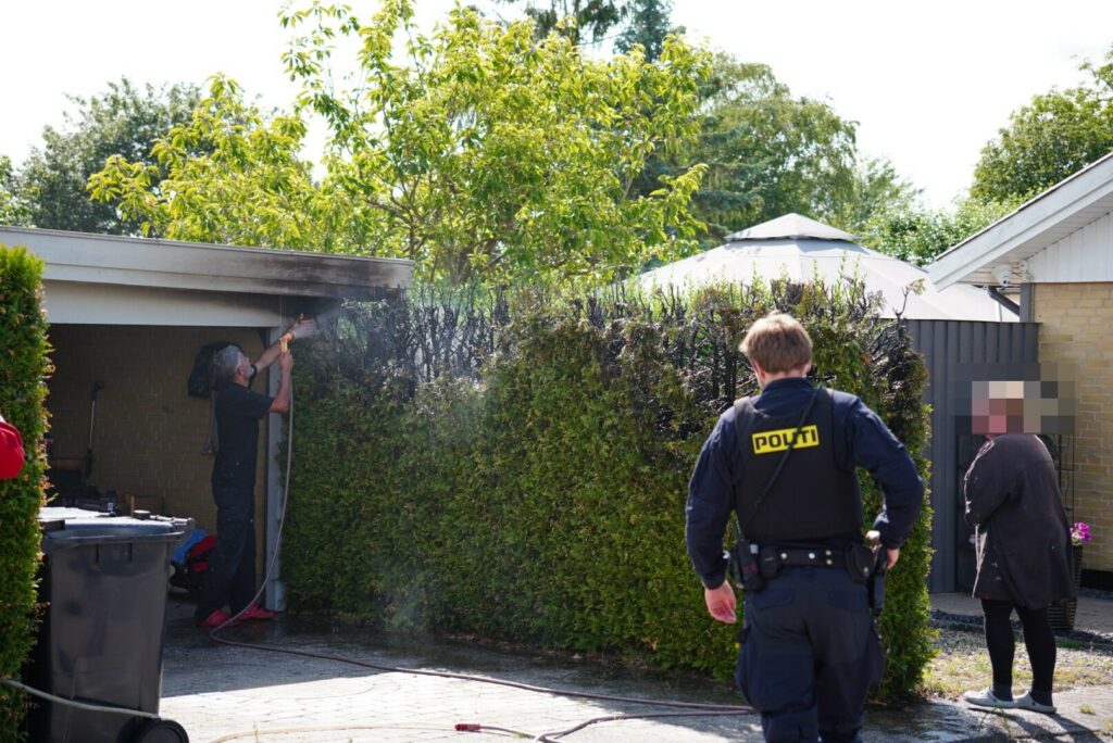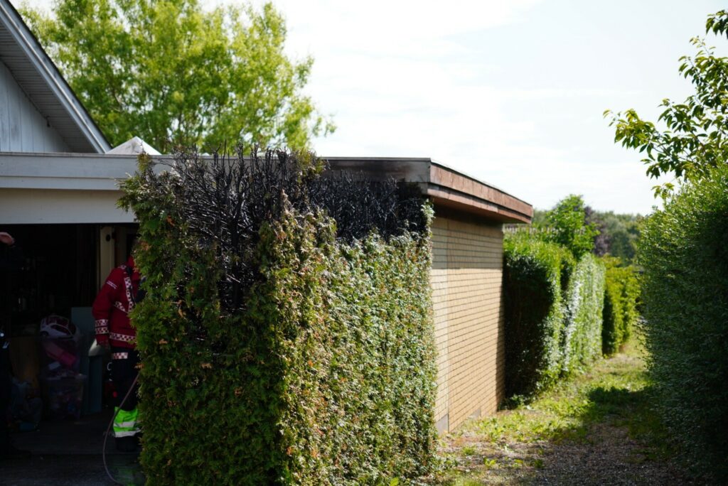 Her har en ukrudtsbrænder fået fat i lidt mere end bare ukrudtet. Både hækken og taget til garagen er blevet brændt og brandvæsnet har netop fået styr på branden.