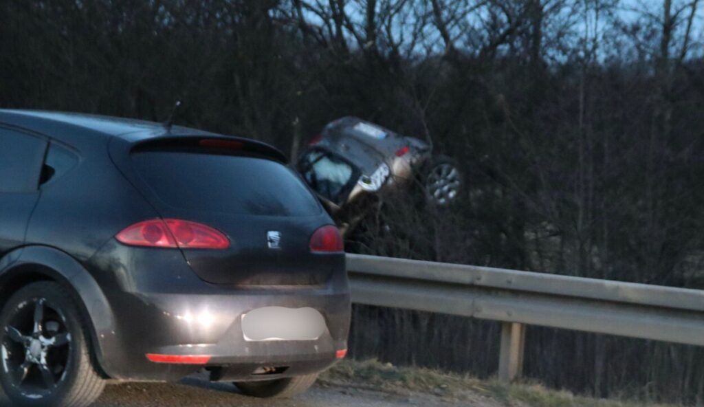 Bilen er kilet fast mellem nogle træer og hænger derfor i luften.