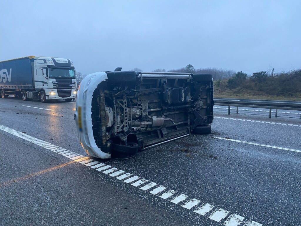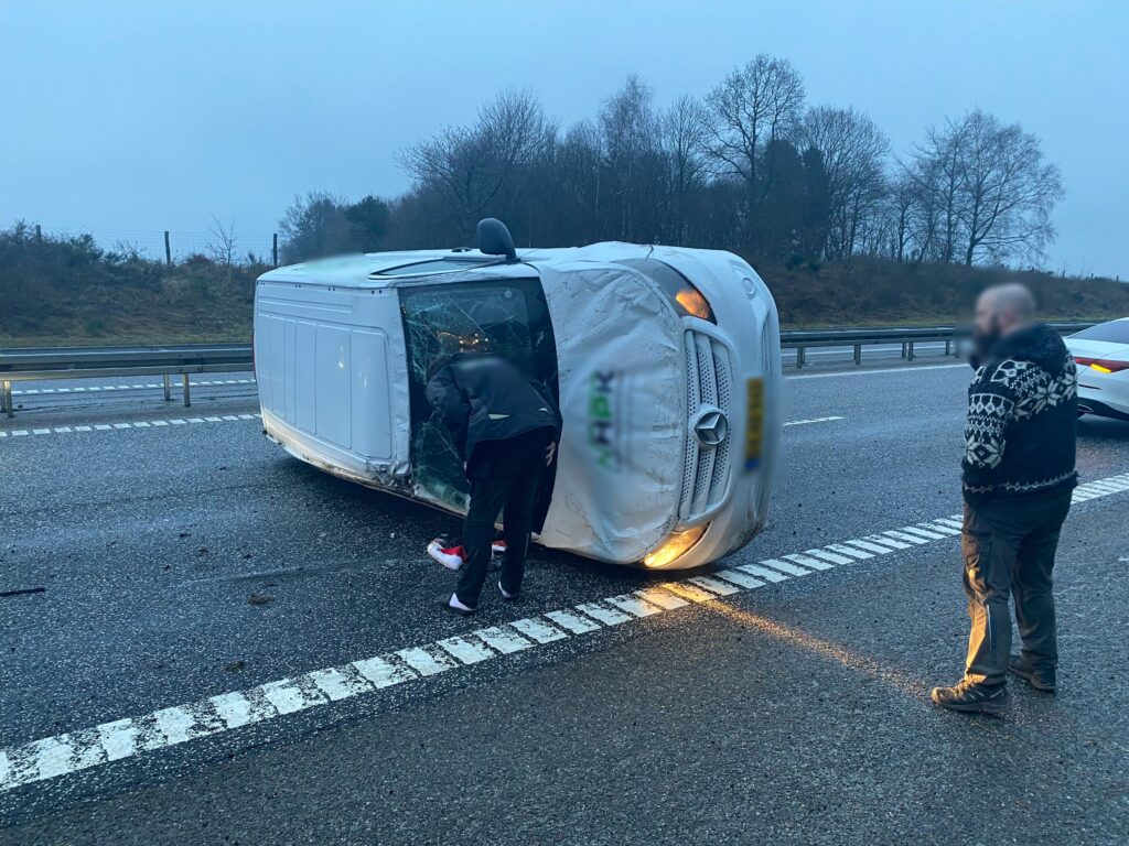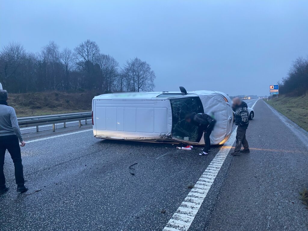 En hvid varevogn er fredag morgen forulykket på Midtjyske Motorvej og væltet om på siden.
