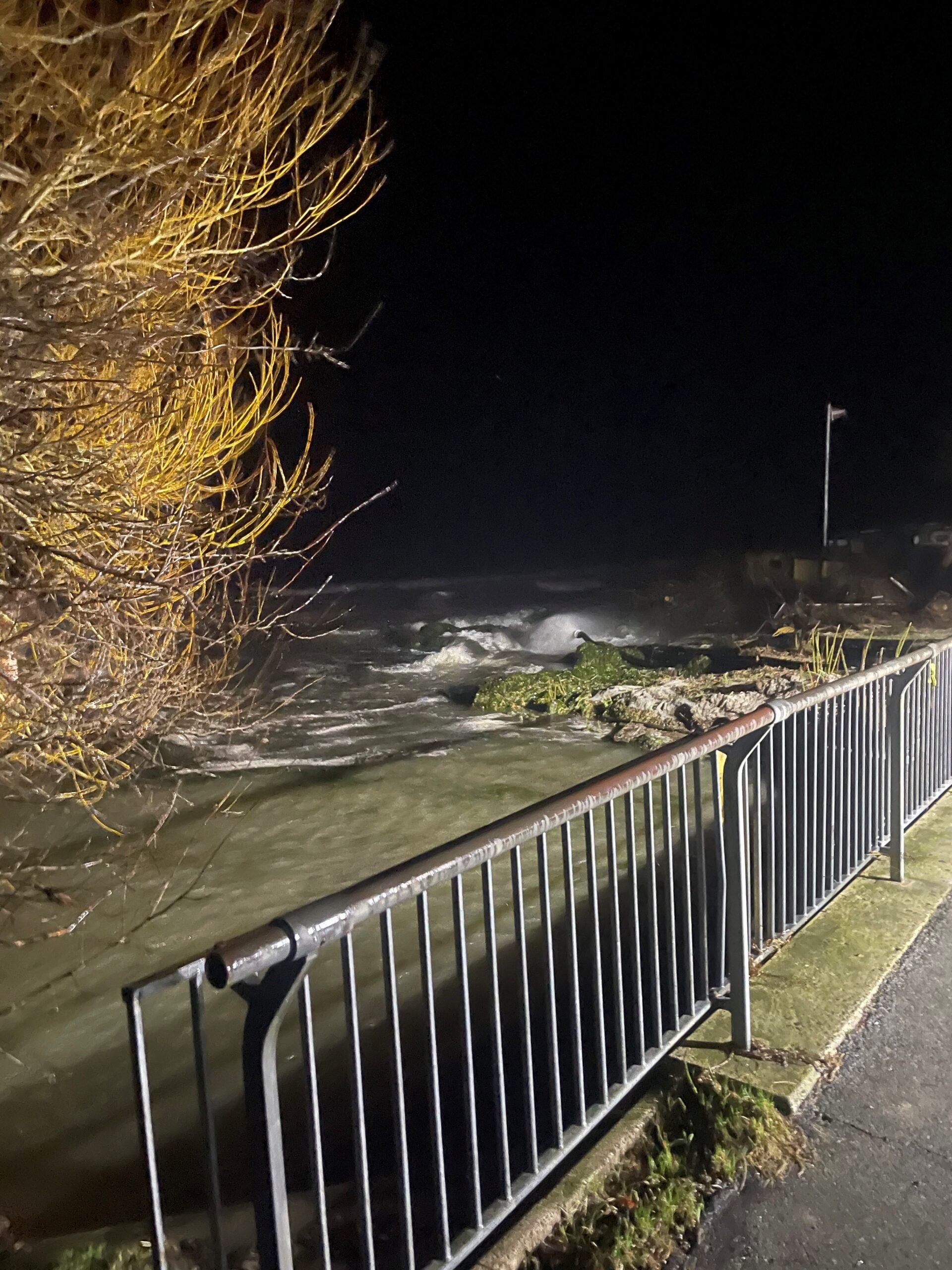 Billeder fra stedet viser at vejen, som ligger lige ud til vandet, oversvømmes grundet det kraftige blæsevejr.