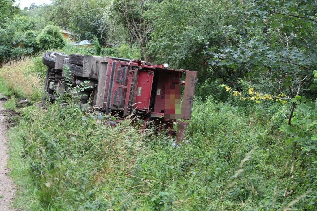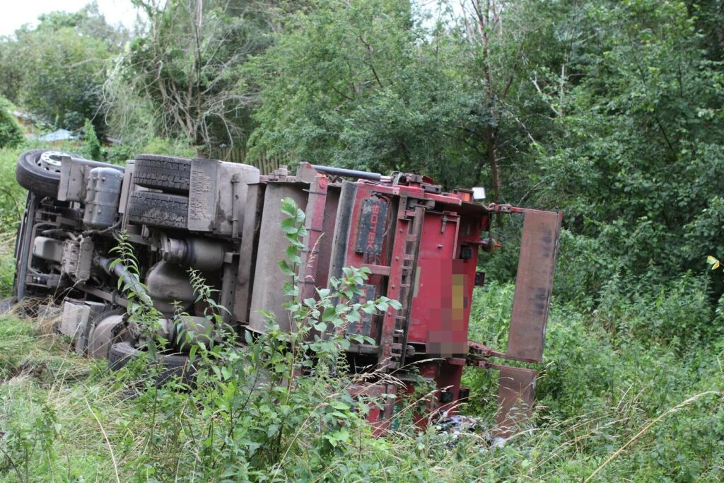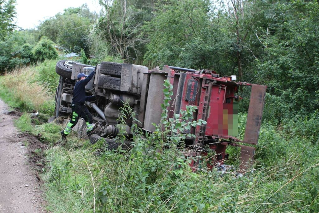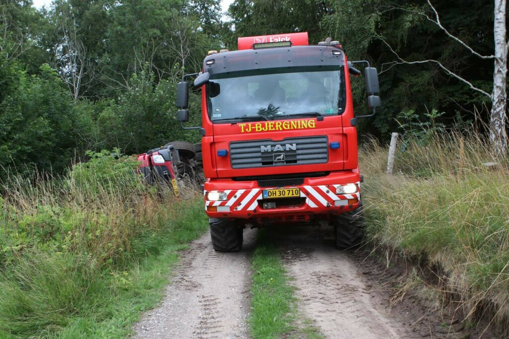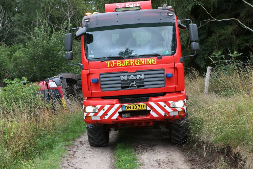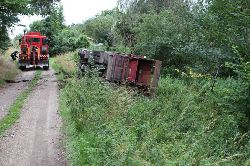 En skraldebil er mandag formiddag væltet på Koholmmosen i Skuldelev nær Skibby.