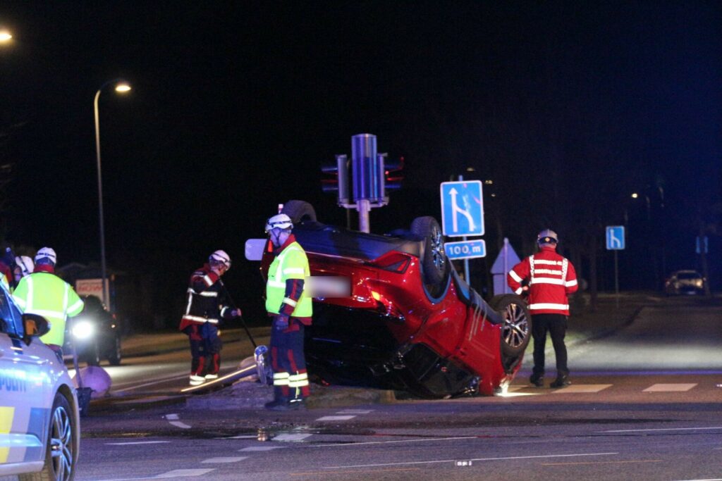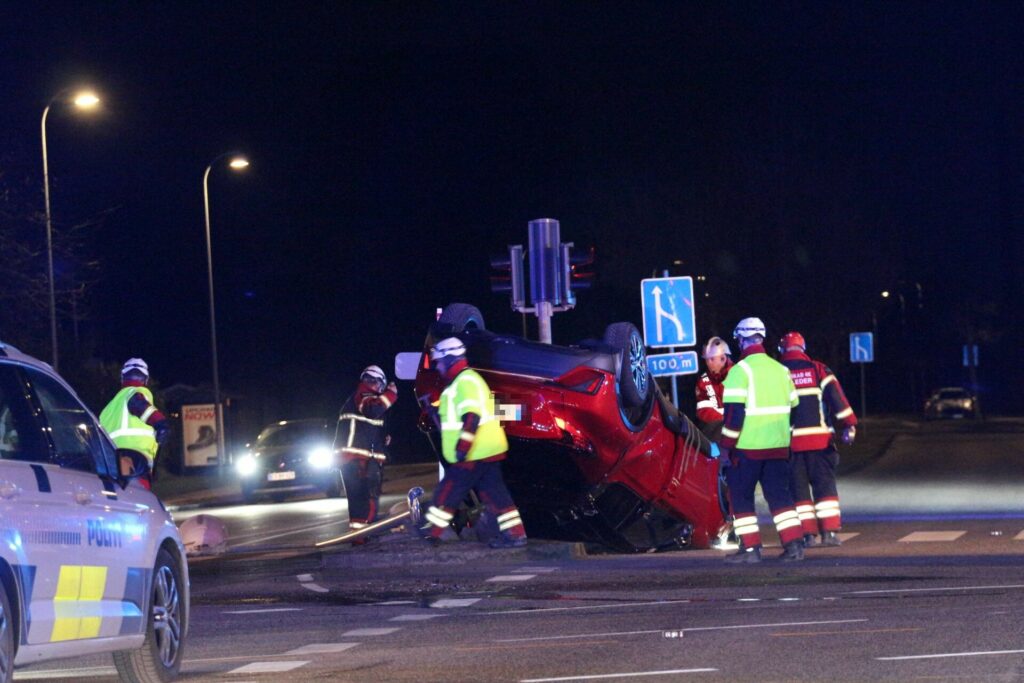 Presse-fotos.dks udsendte oplyser efter at have talt med vidner, at der er tale om et solouheld, hvor personbilen er væltet rundt på taget efter at have påkørt et lyskryds.