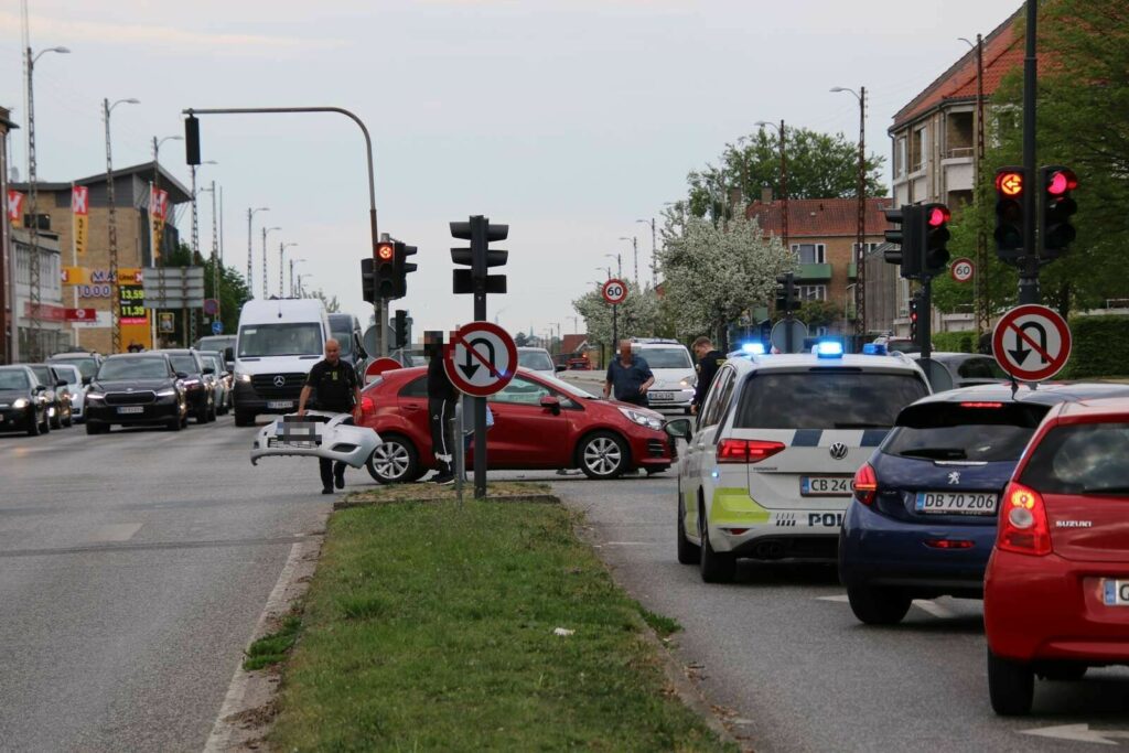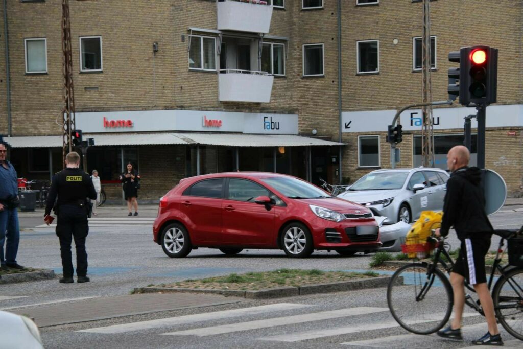 Begge biler holder nu i krydset med tydelige skader.
