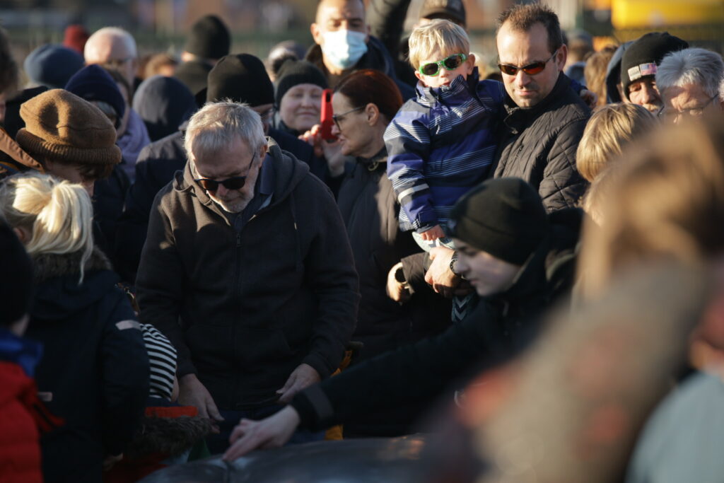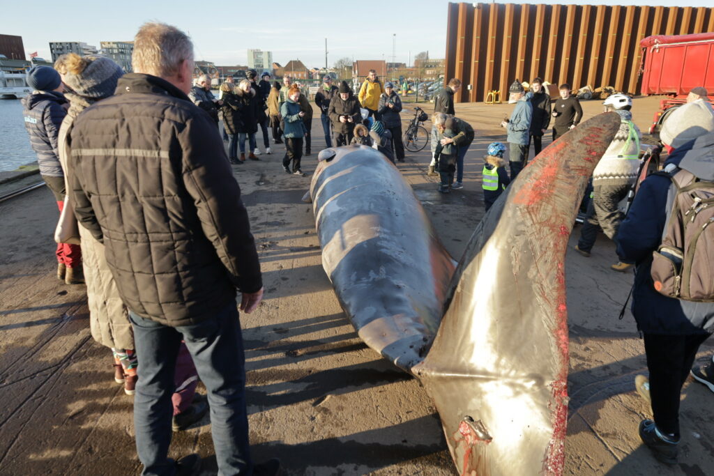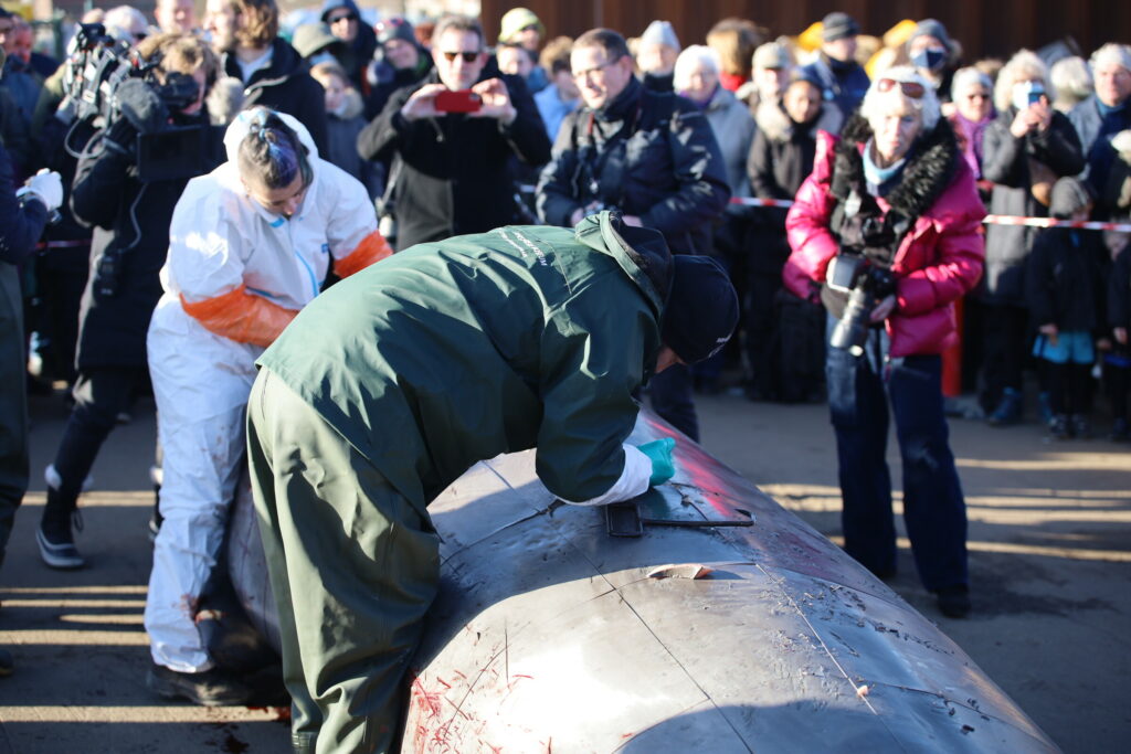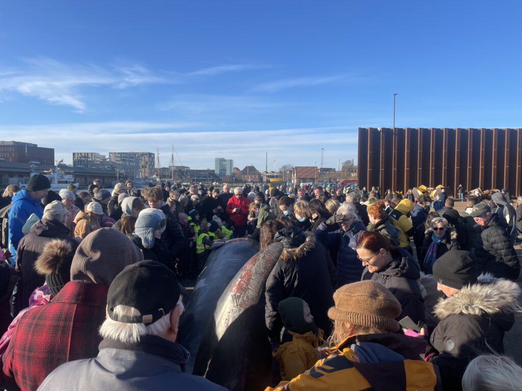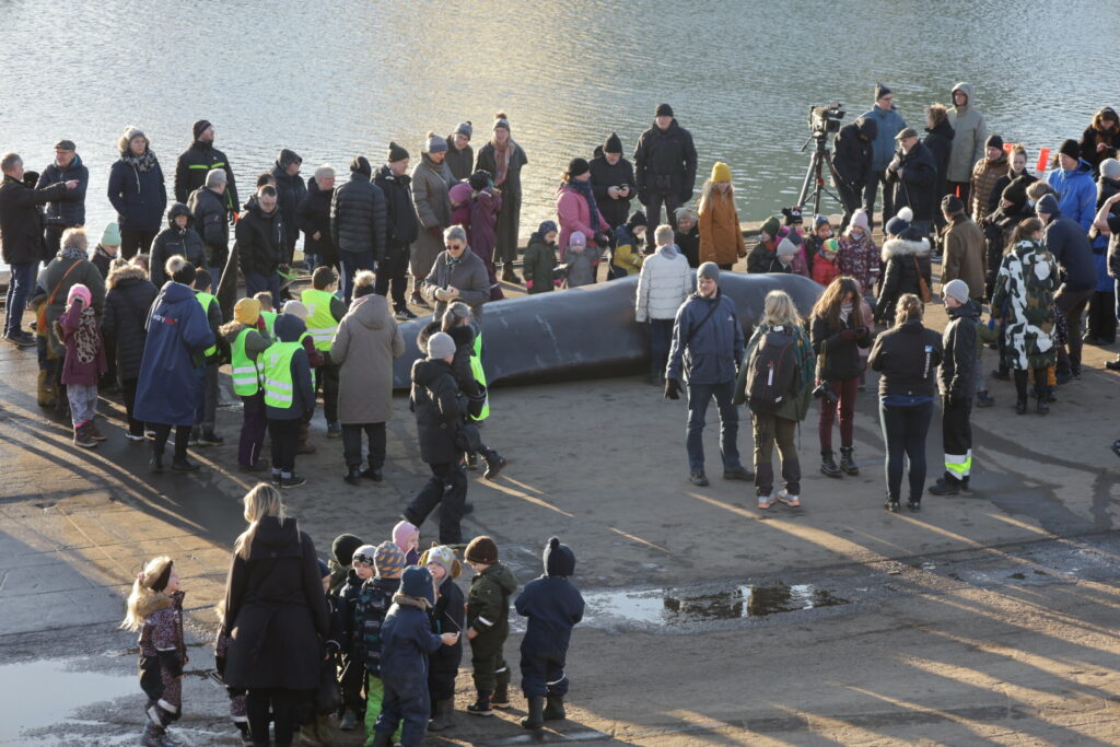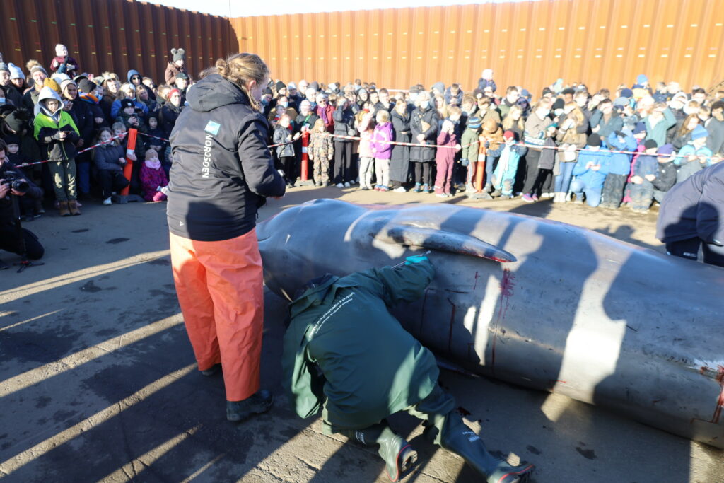 Der var især mange børn blandt de fremmødte, som stod og overværede den nærmere inspektion af hvalen, som skal fastslå dødsårsagen.