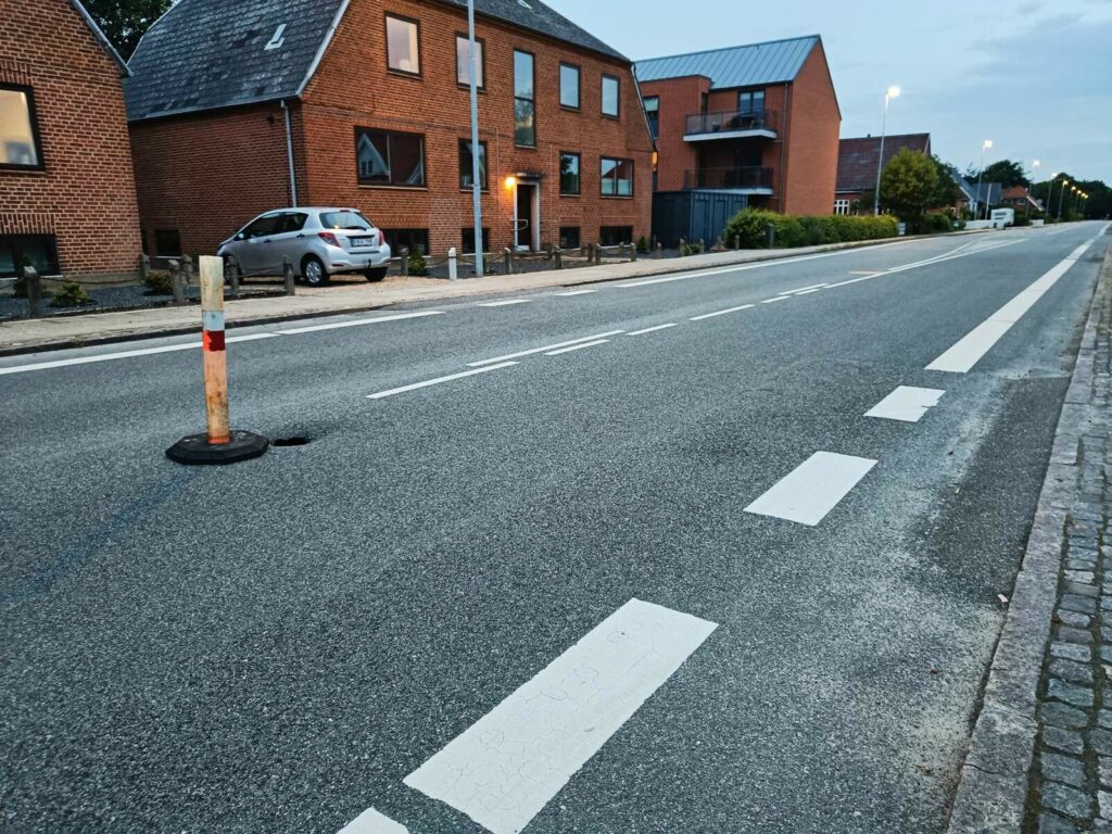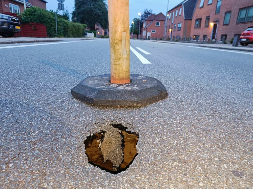 Et stort hul er slået i asfalten på en beboelsesvej i den sydjyske by Grindsted