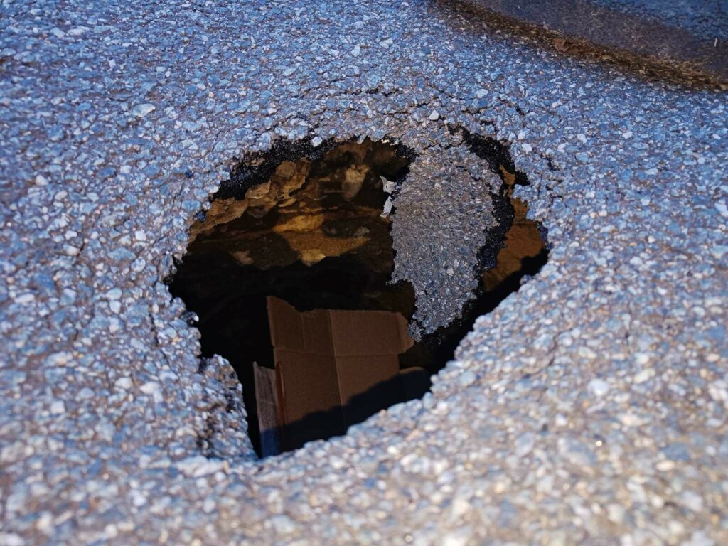 Hullet bliver under jorden til et endnu større hul på omkring 80 gange 80 gange 80 centimeter, oplyser Presse-fotos.dks udsendte, der er noget forbløffet over det store hul i vejen.