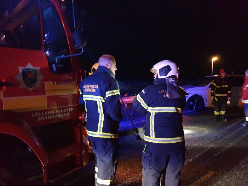 Brandfolk og redningsmandskab var hurtigt fremme – vejen Strandholmsøvej i Rødby er spærret mens oprydning pågår.