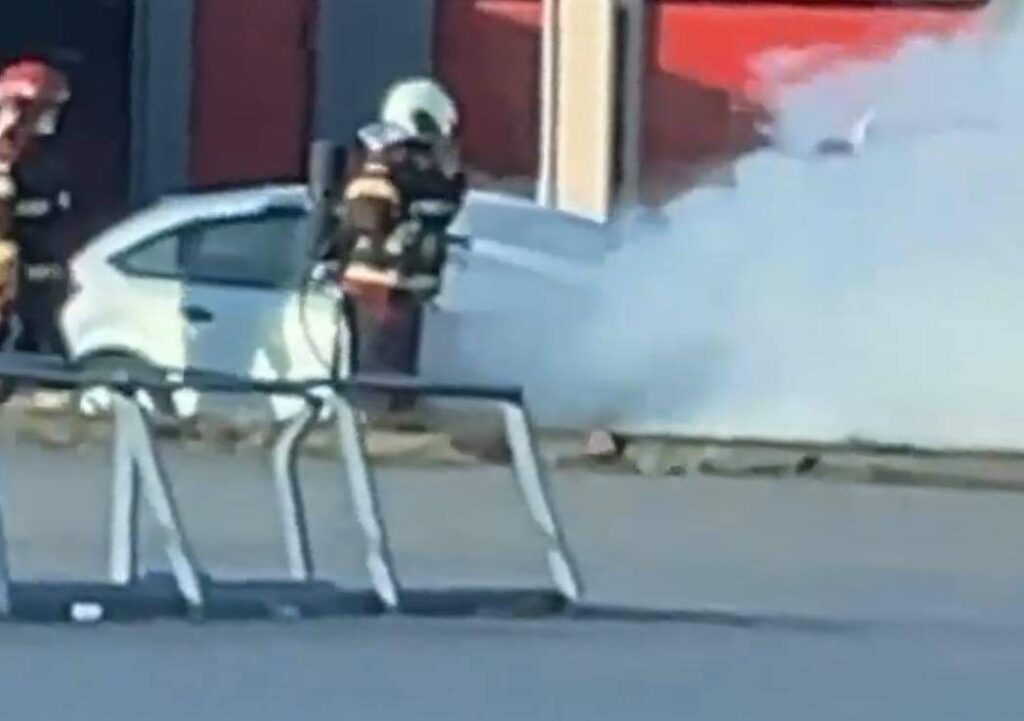 Anmelder forsøgte selv at slukke branden med en pulverslukker, men uden held.