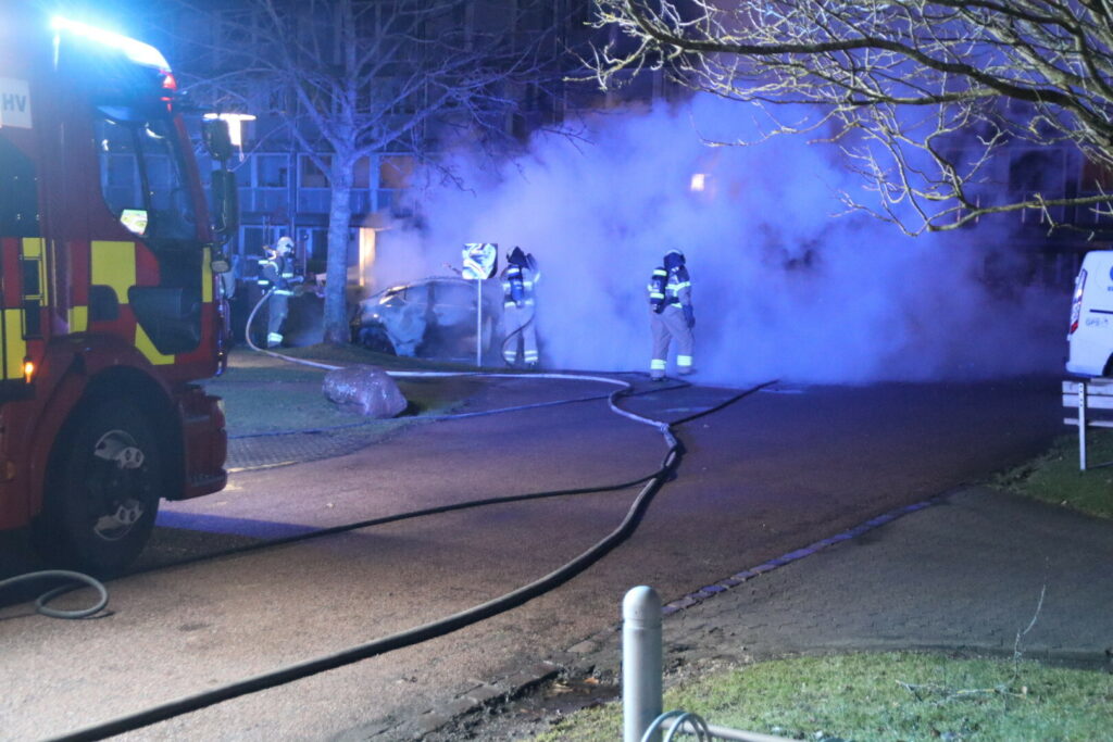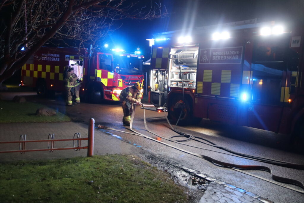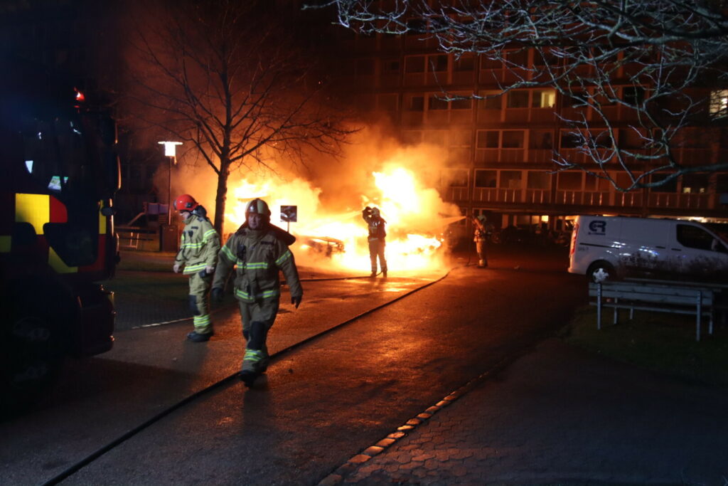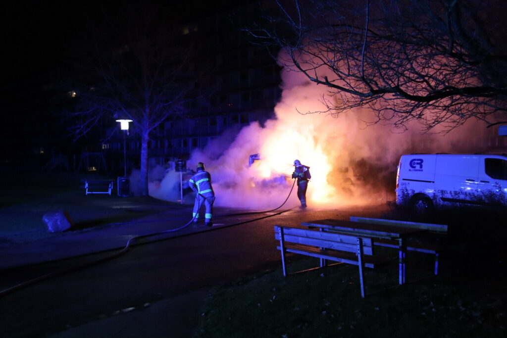 Flammerne står højt over køretøjet og brandvæsnet kæmper med slukningsarbejdet.