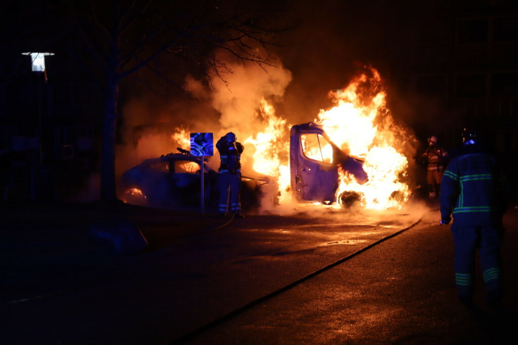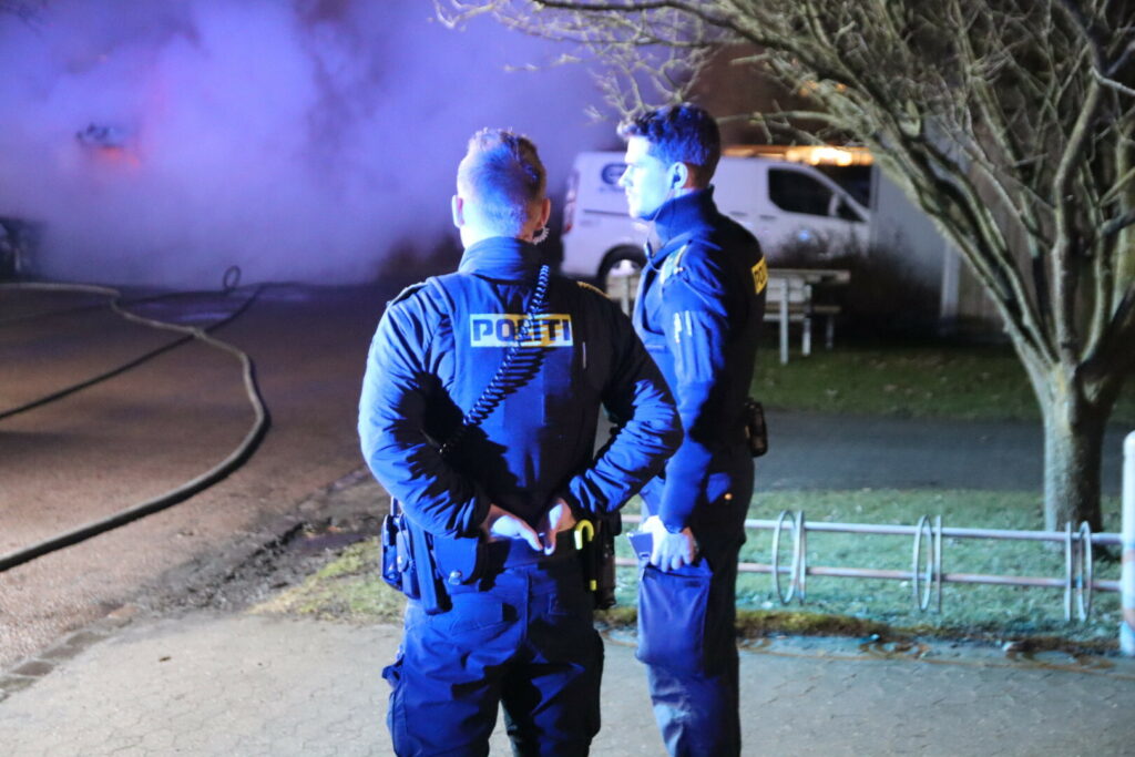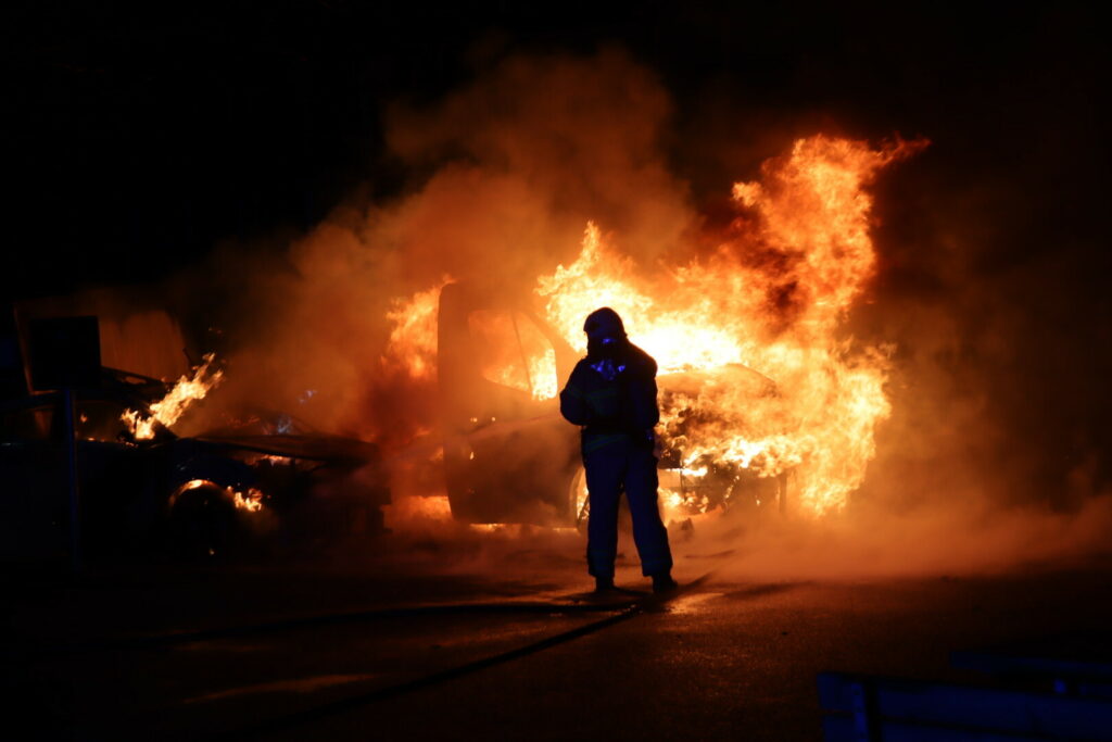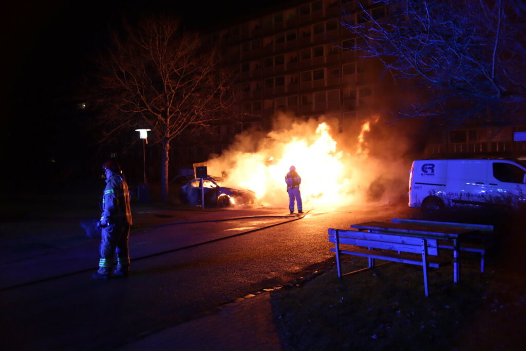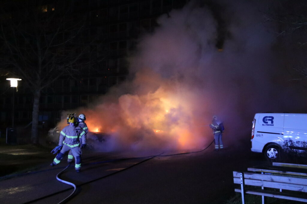 Flammerne står højt over køretøjet og brandvæsnet kæmper med slukningsarbejdet.