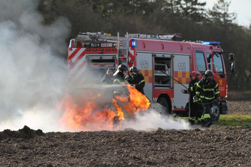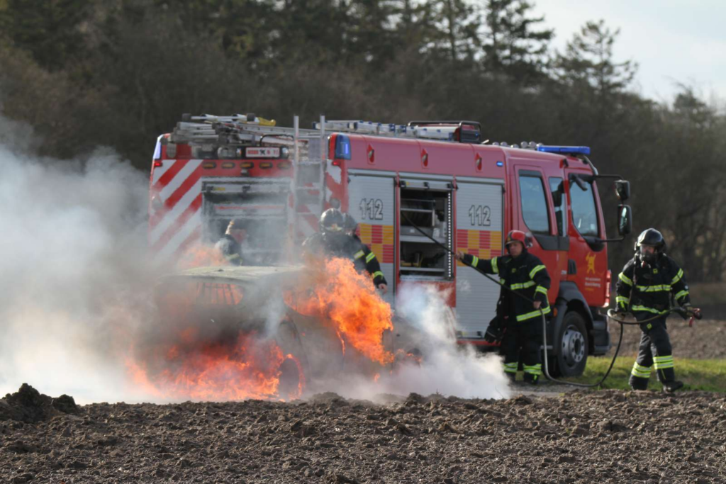 Fremme på stedet oplyser Presse-fotos.dks udsendte, at bilen er fuldstændig indhyllet i flammer.