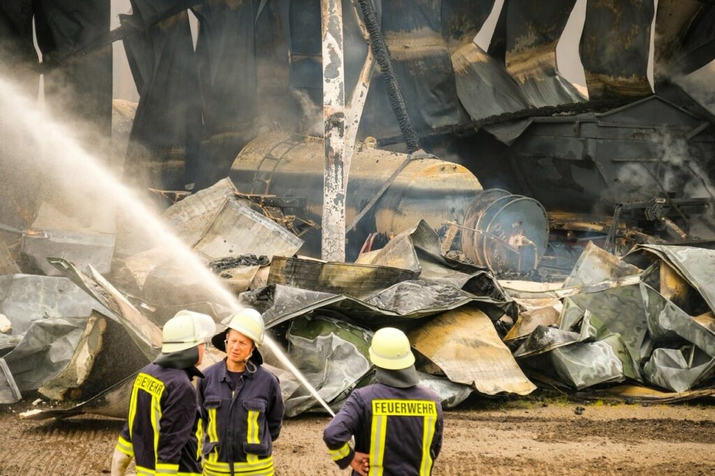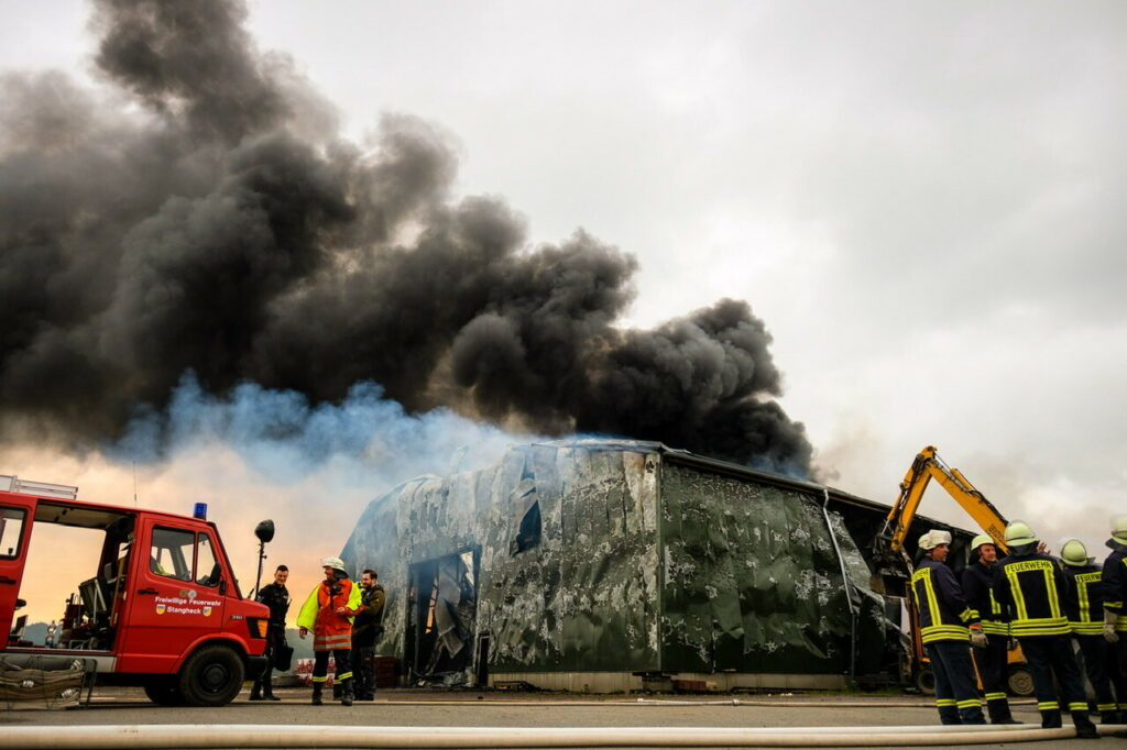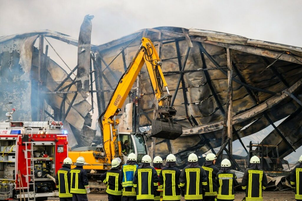 En voldsom brand tilintetgjorde lørdag morgen en stor hal syd for grænsen til Tyskland.